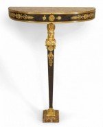 PAIR of French Empire-style (19th Century) bronze and dore trim bracket console tables with half round marble top supported on a single leg ending in a square marble base. (PRICED AS PAIR)