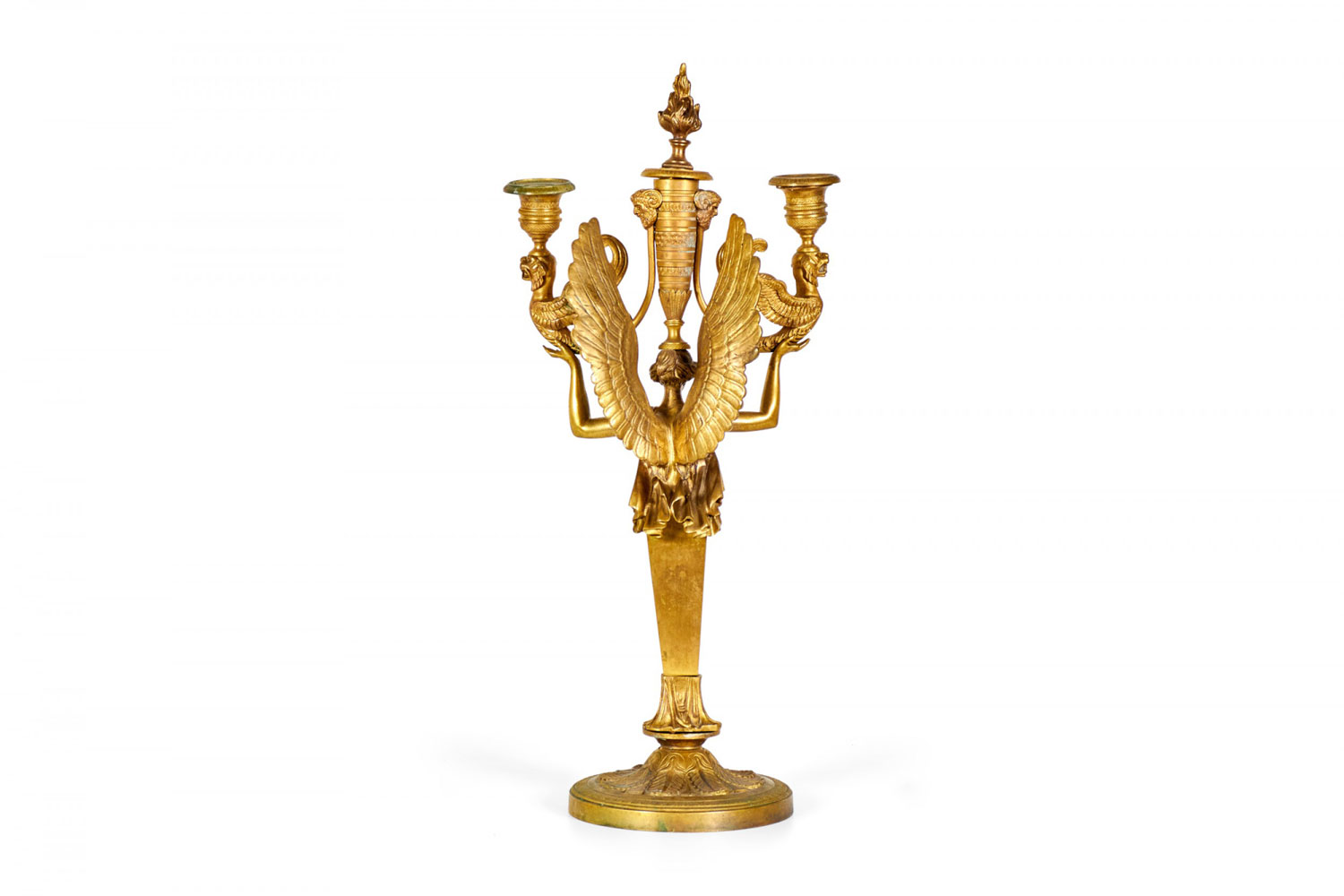 PAIR of French Empire bronze dore 3 arm classical winged figural candelabras with finials holding two griffins on round bases. (PRICED AS PAIR)