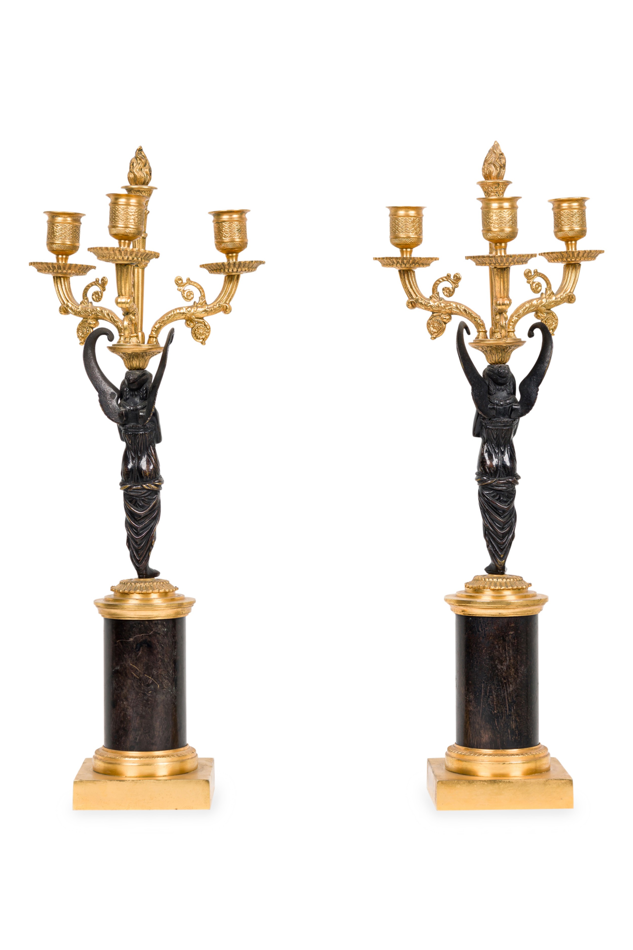 PAIR of French Empire-style (20th Century) gilt and patinated bronze 3 light candelabra with winged figural columns and flame finial on ormolu mounted base. (PRICED AS PAIR).