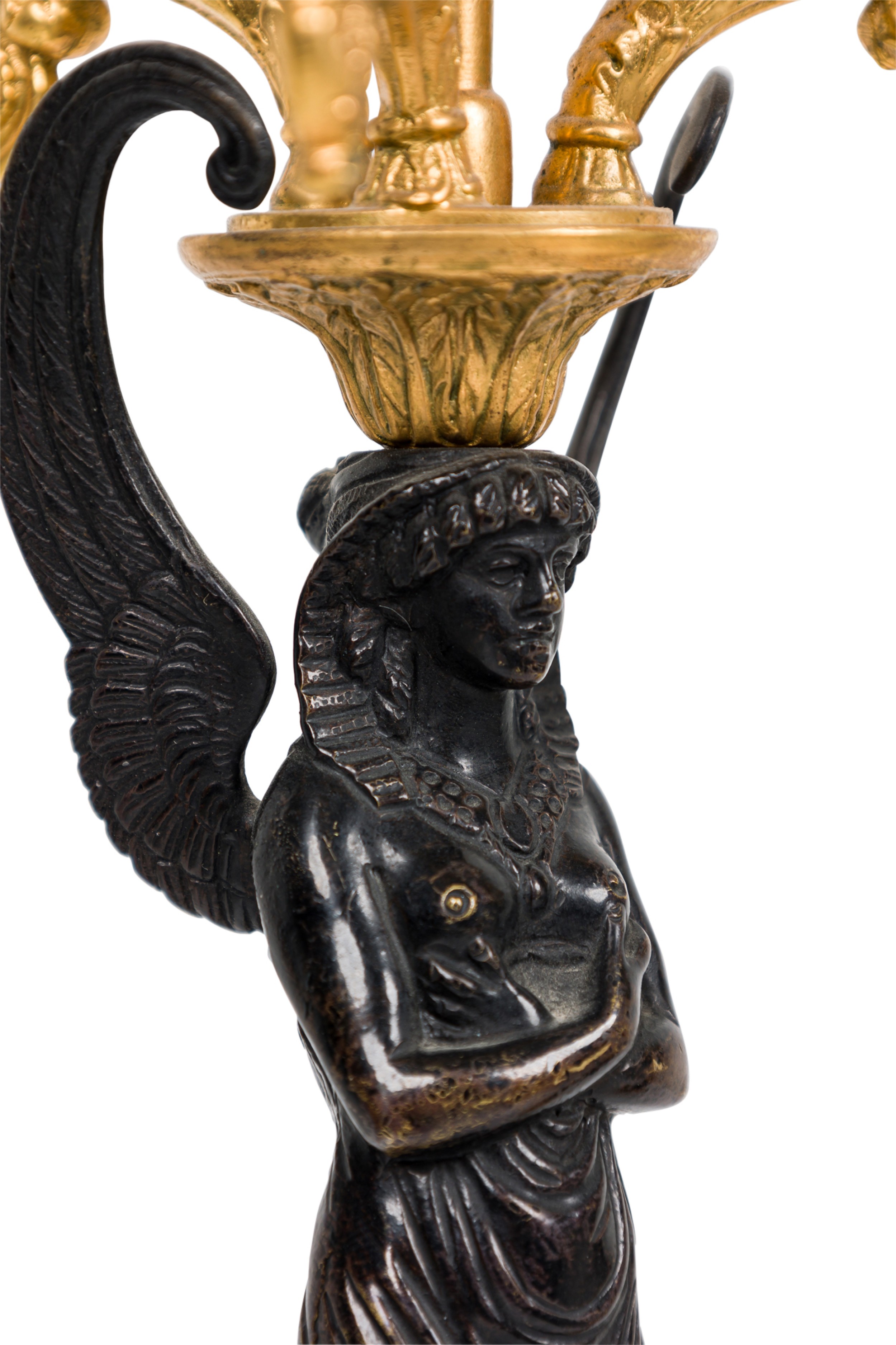 PAIR of French Empire-style (20th Century) gilt and patinated bronze 3 light candelabra with winged figural columns and flame finial on ormolu mounted base. (PRICED AS PAIR)
