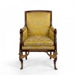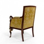 PAIR of French Empire-style (19th Century) mahogany swan design bergere Armchairs with bronze trim, griffin legs, and gold upholstery (PRICED AS PAIR)