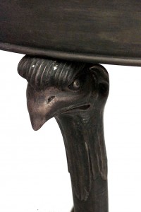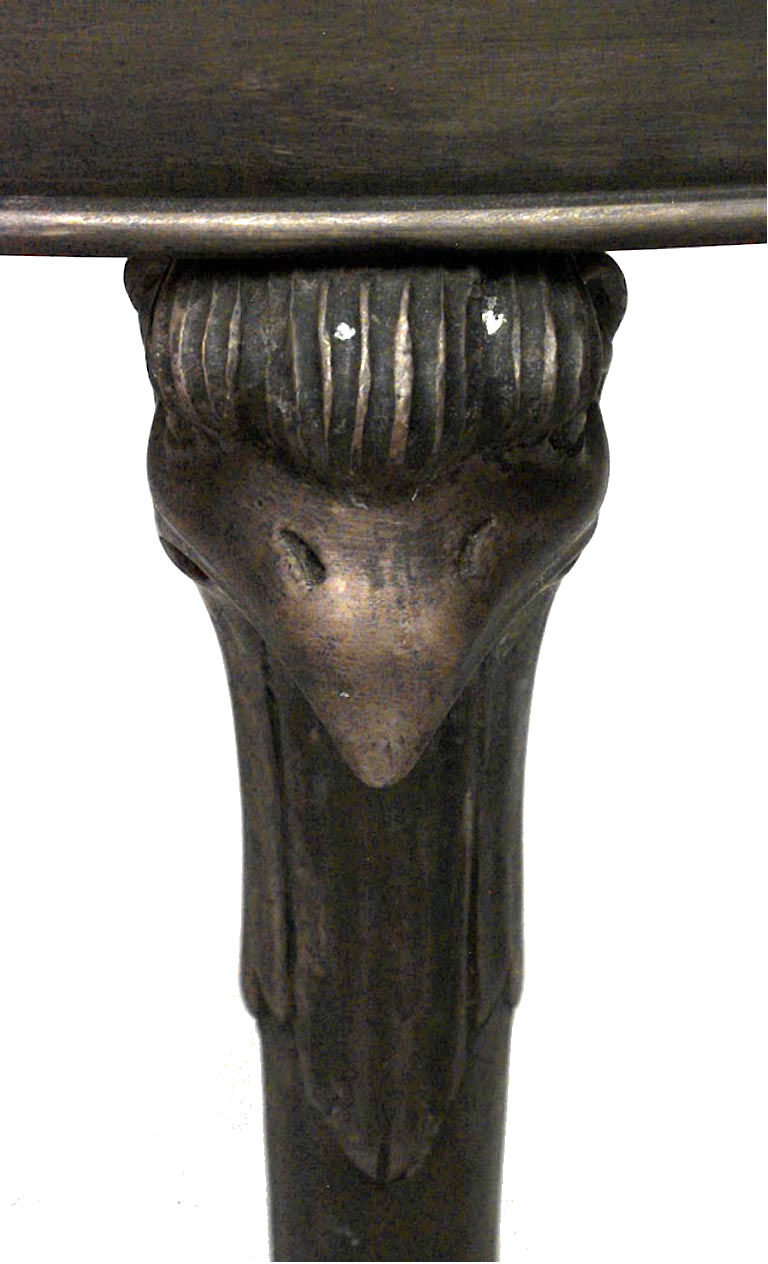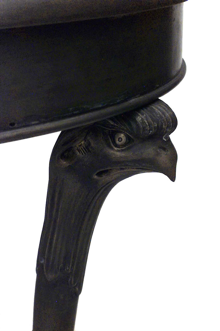 PAIR of French Empire-style round bronze 3 legged gueridon tables with eagle heads and inlaid marble top and triangular platform base. (PRICED AS PAIR)