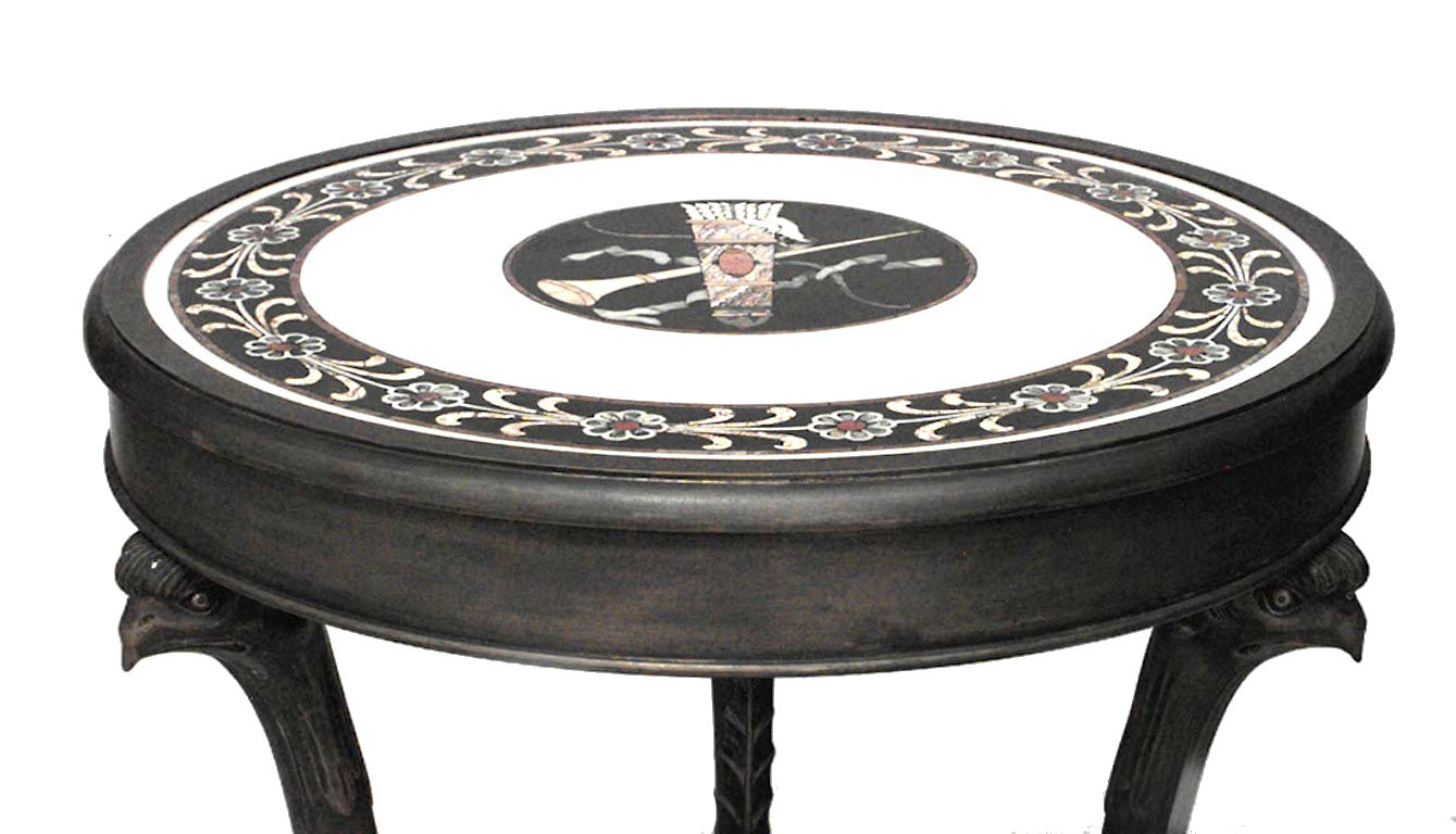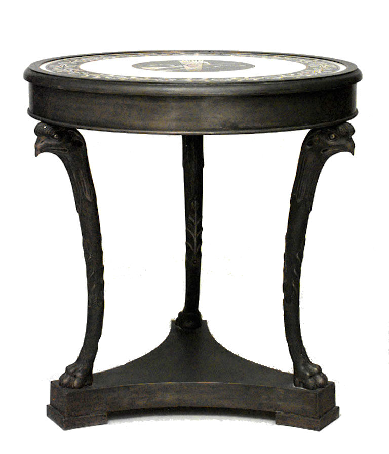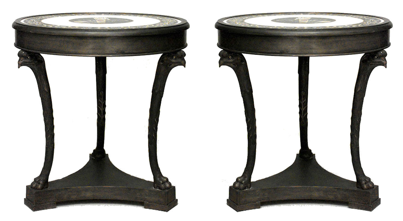 PAIR of French Empire-style round bronze 3 legged gueridon tables with eagle heads and inlaid marble top and triangular platform base. (PRICED AS PAIR).