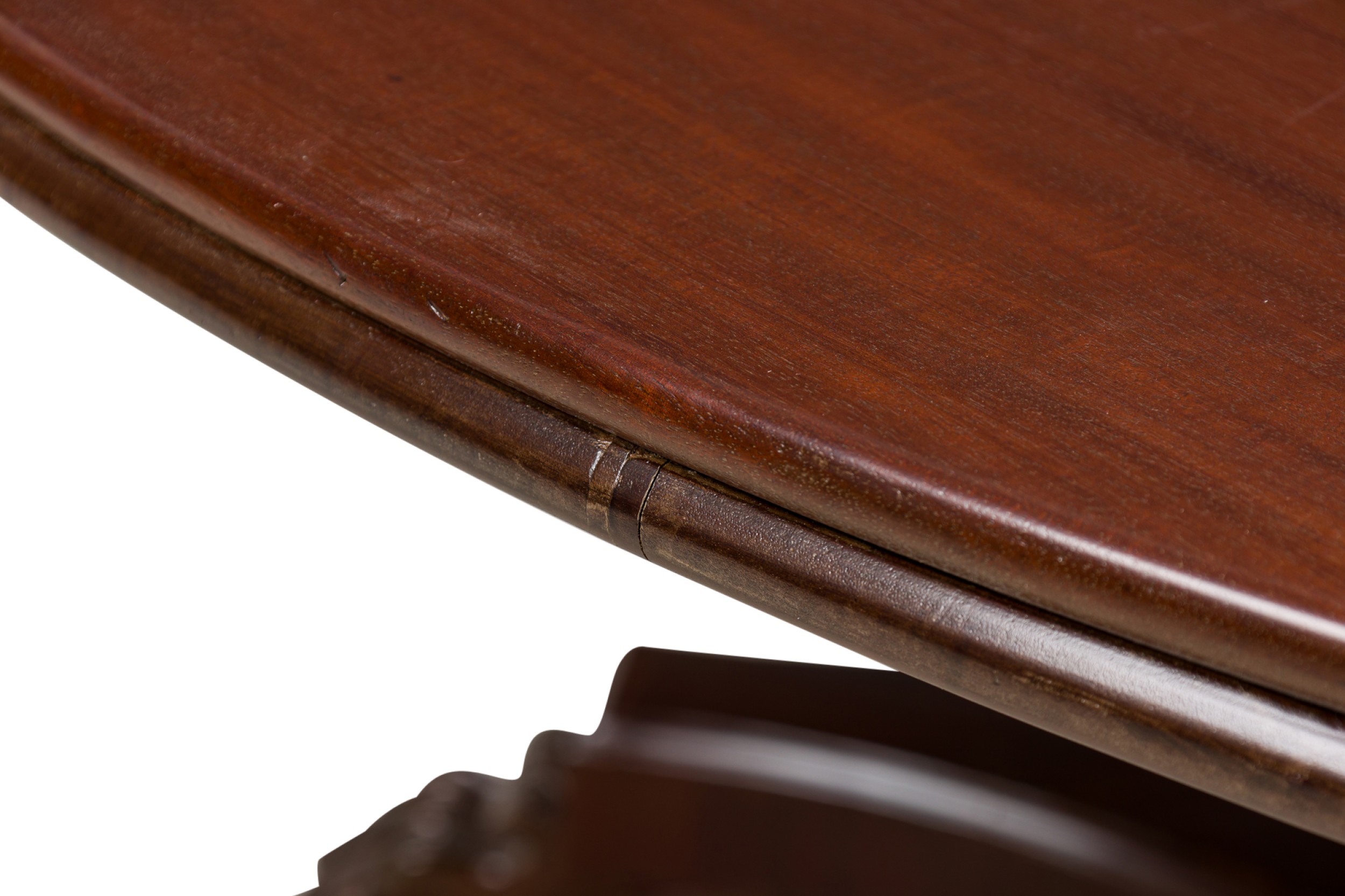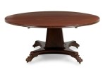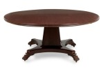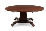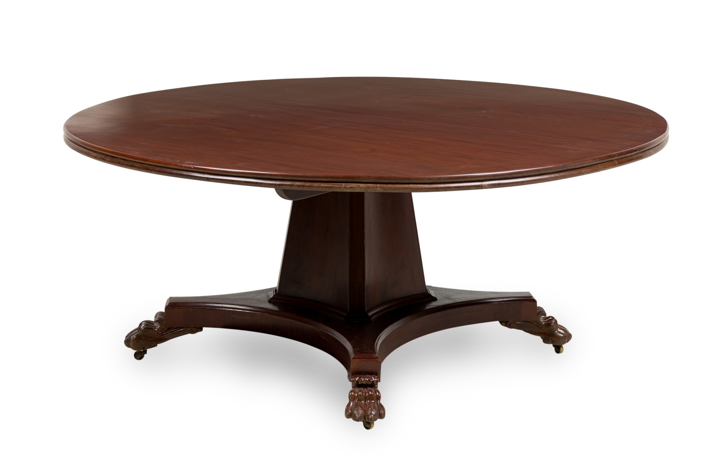 French Restoration (1840s) large round mahogany dining table with a circular top resting on a tapered square pedestal base resting on a platform ending with four carved paw feet with castors.