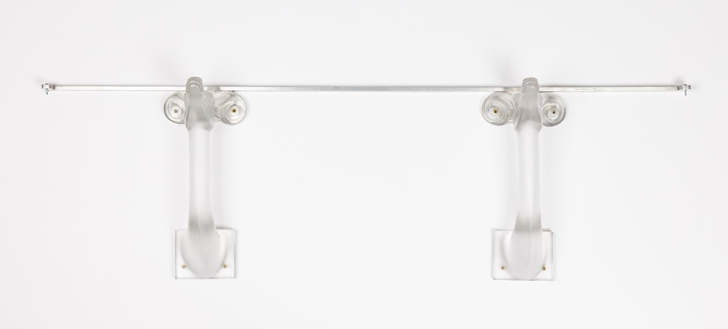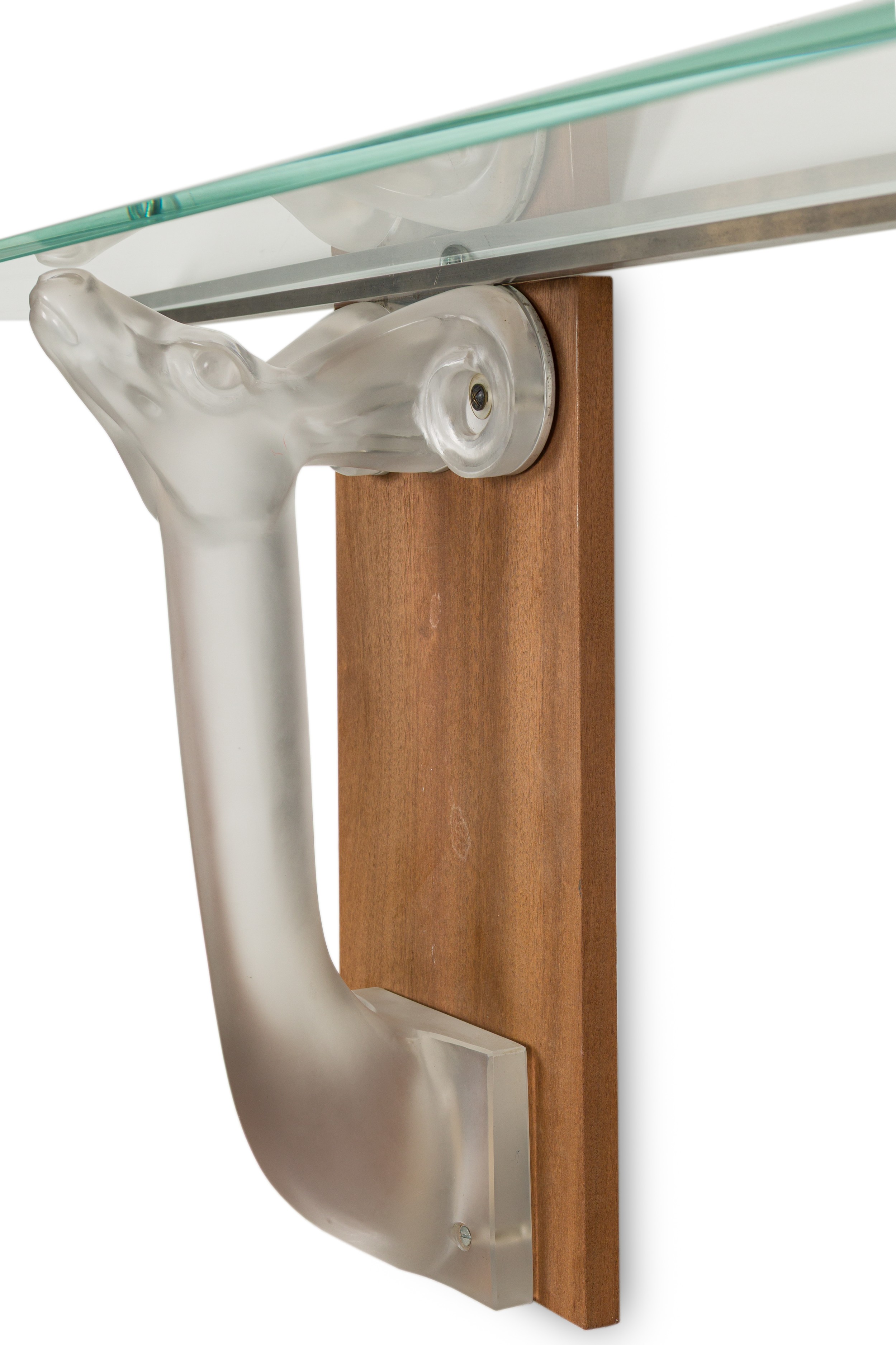 French (Circa 1975) wall bracket console table with 2 stylized frosted glass deer heads supporting a narrow glass top (Lalique Molded Glass 'Moulfon' Table, Designed by MARC LALIQUE)