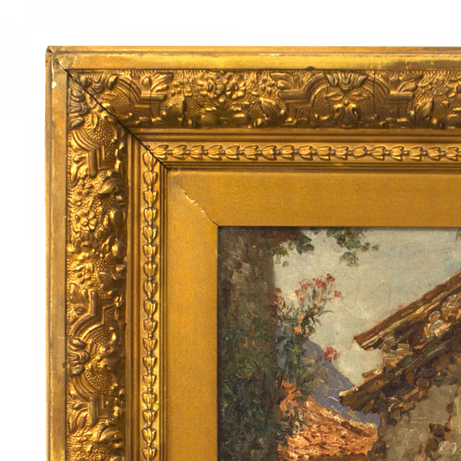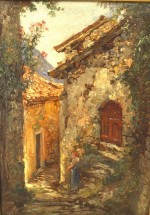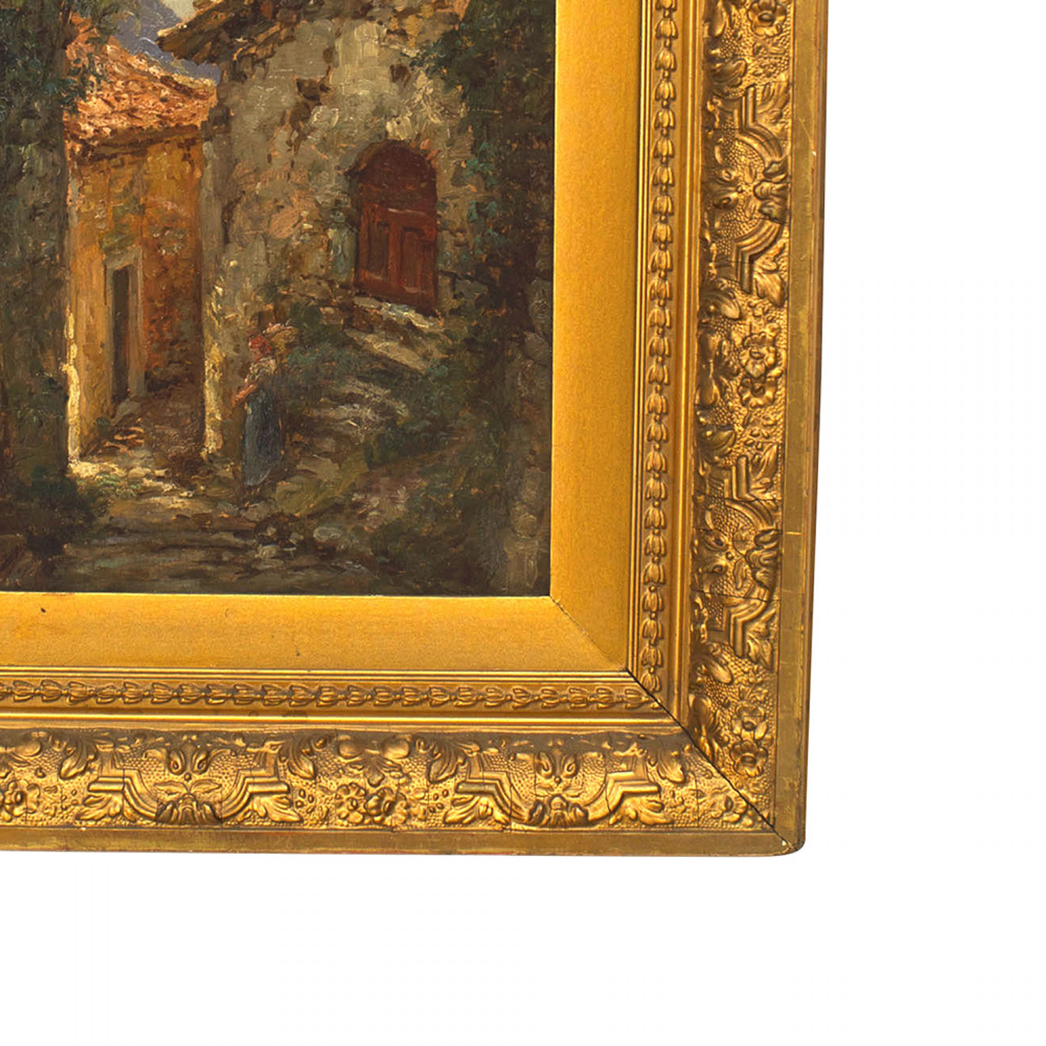 French Impressionist (19th Cent) carved gilt framed oil cobbled street scene, painting of lady by steps of house.