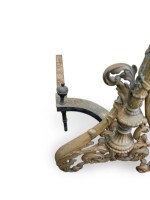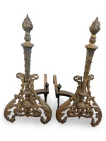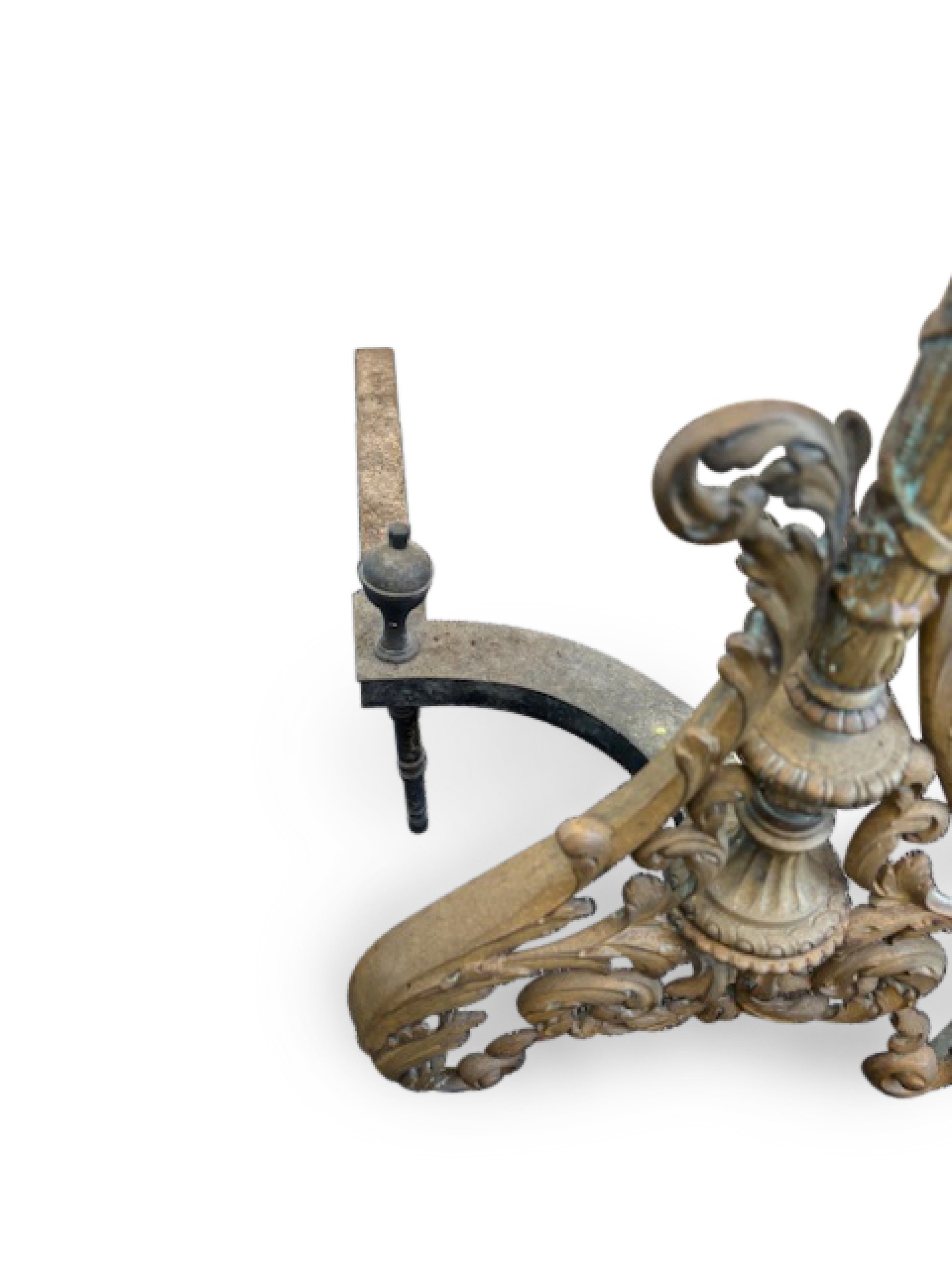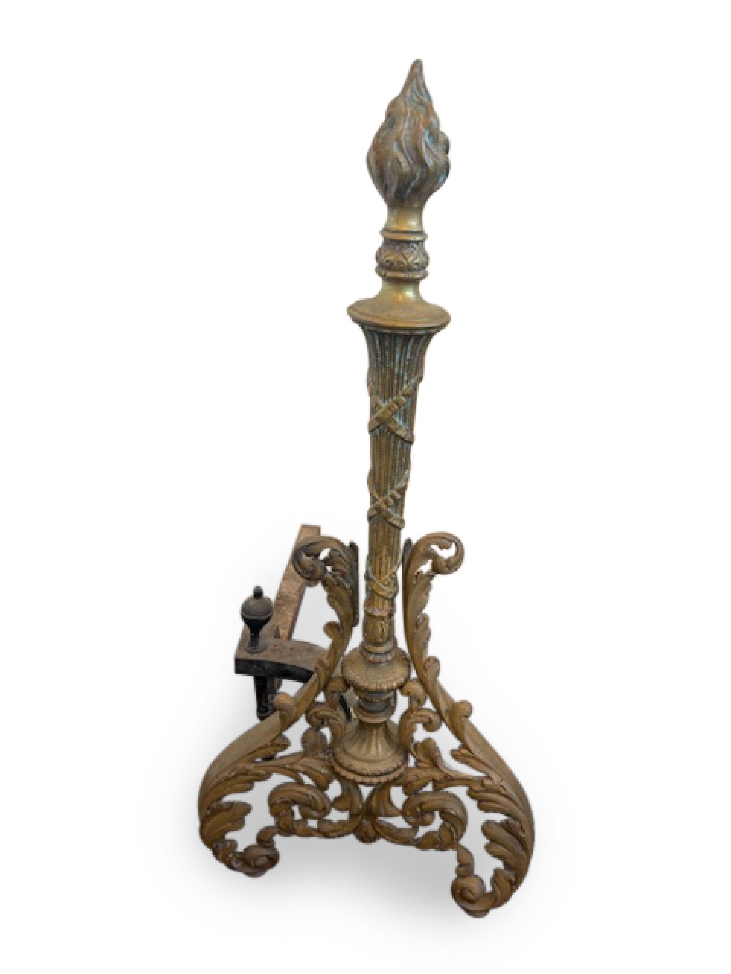 French Louis XV style (19th Century) bronze andirons with filigree scroll base centering a torch form with a flame finial top.