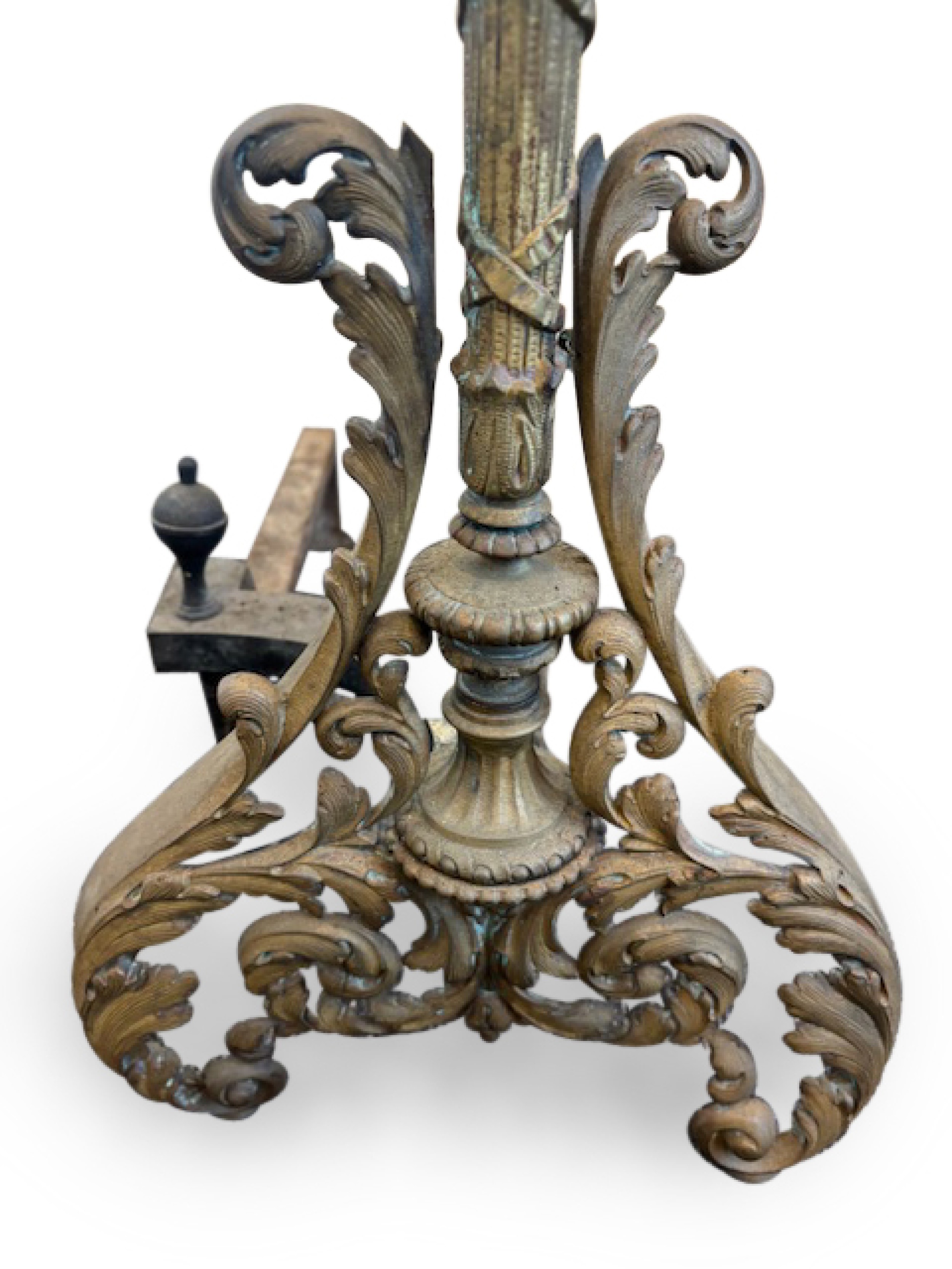 French Louis XV style (19th Century) bronze andirons with filigree scroll base centering a torch form with a flame finial top
