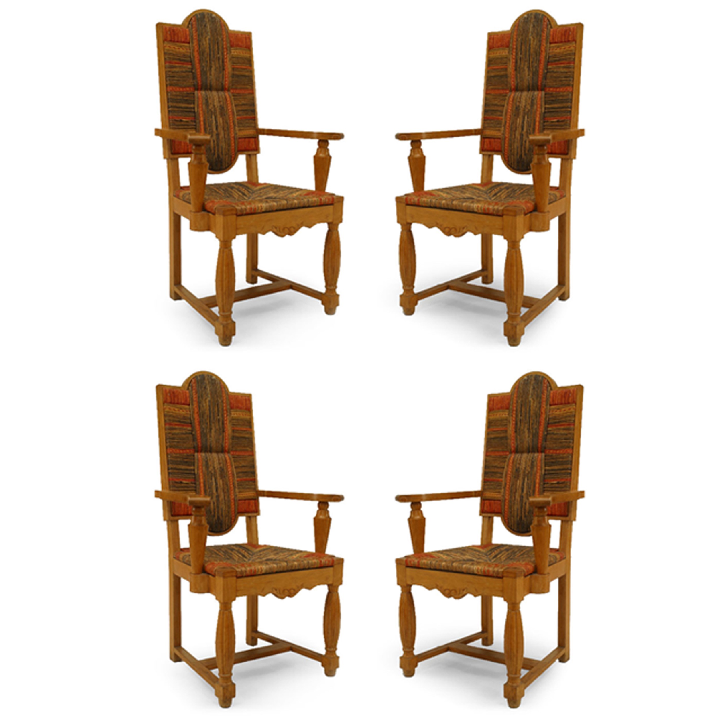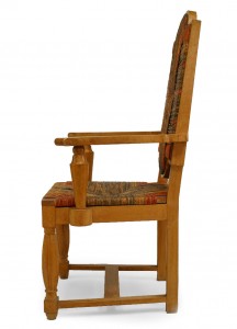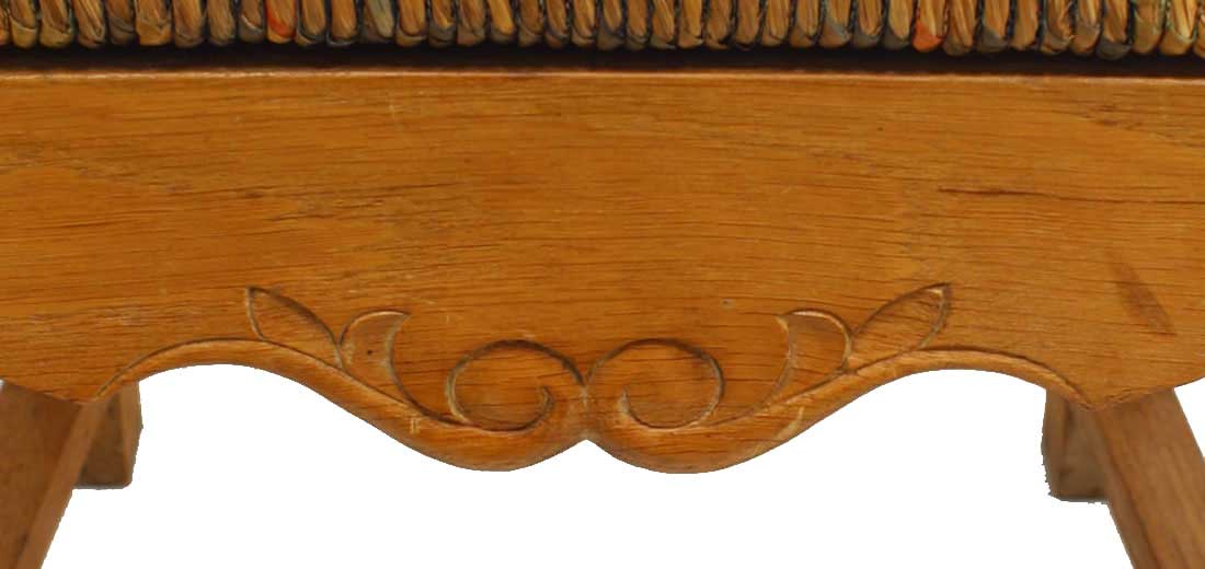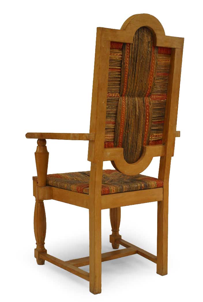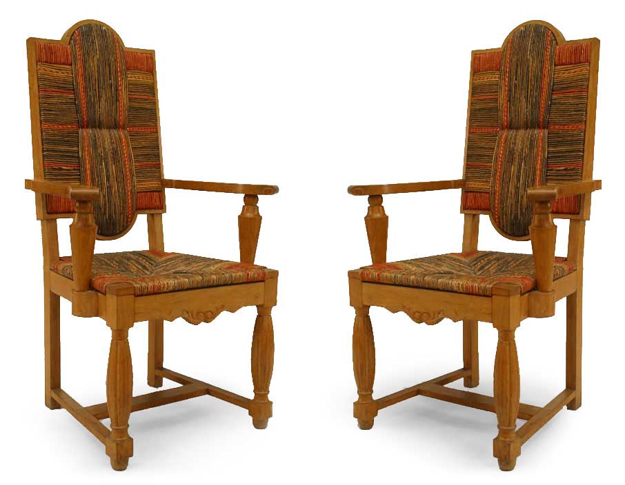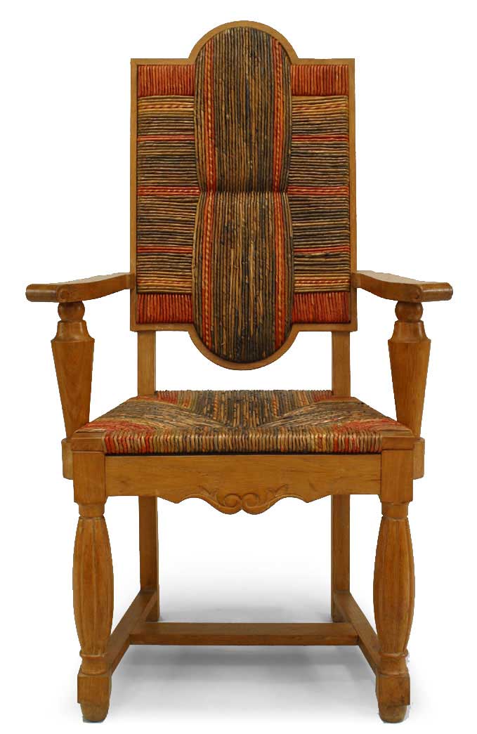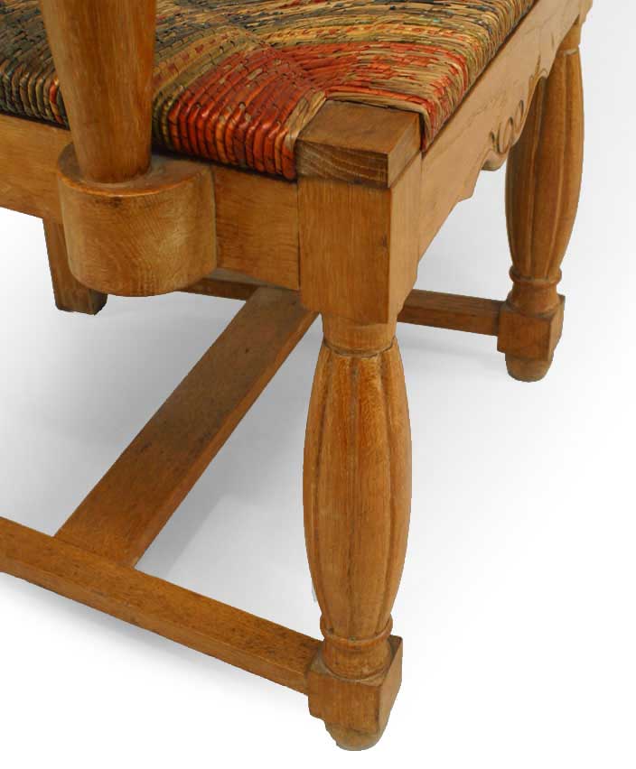 SET of 4 French 1940s oak Louis XIV style arm chairs with natural, red, and multicolored sea grass back and seat (att: ANDRE ARBUS, ref: pg 205) (PRICED AS SET OF 4).
