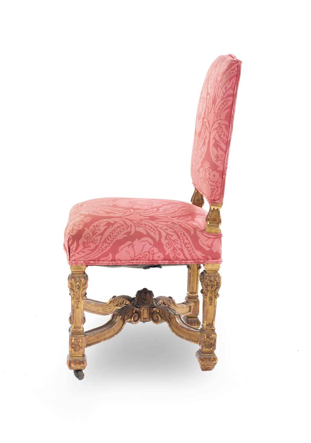 SET of 9 French Louis XIV style (19th Century) gilt chairs with rose damask upholstery. 2 arm chairs: 24½"w 21"d 44½"h, 7 side chairs (PRICED AS SET)..
