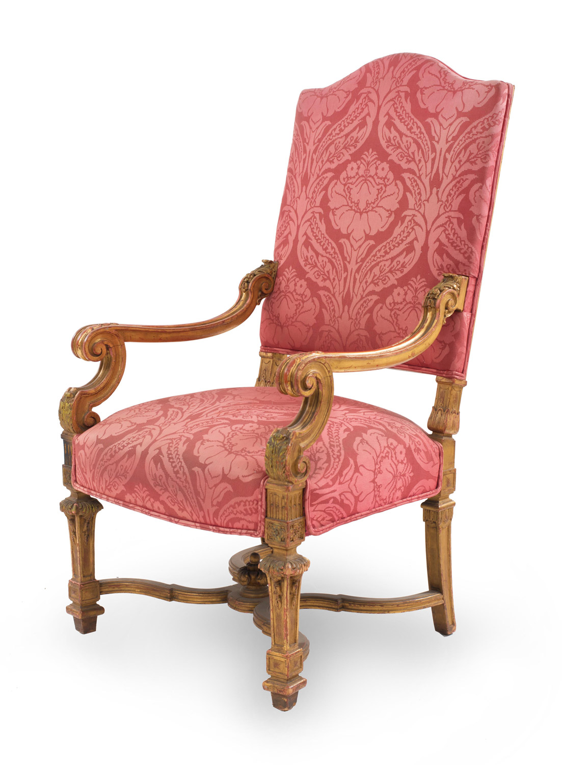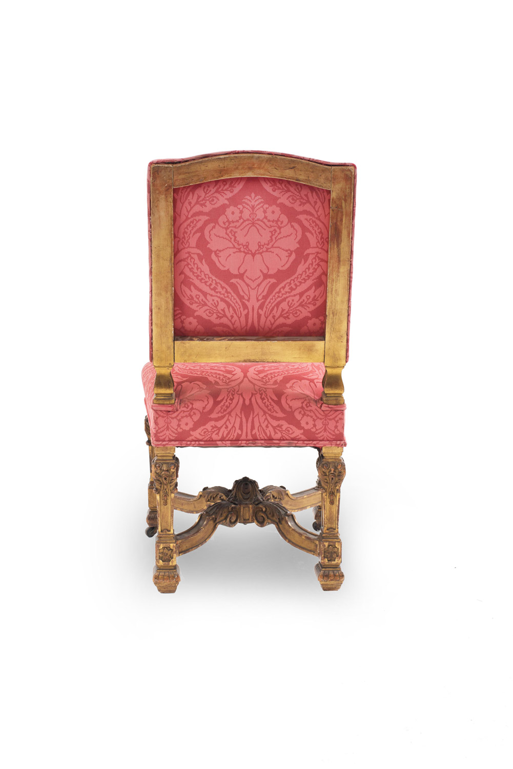 SET of 9 French Louis XIV style (19th Century) gilt chairs with rose damask upholstery. 2 arm chairs: 24½"w 21"d 44½"h, 7 side chairs (PRICED AS SET).