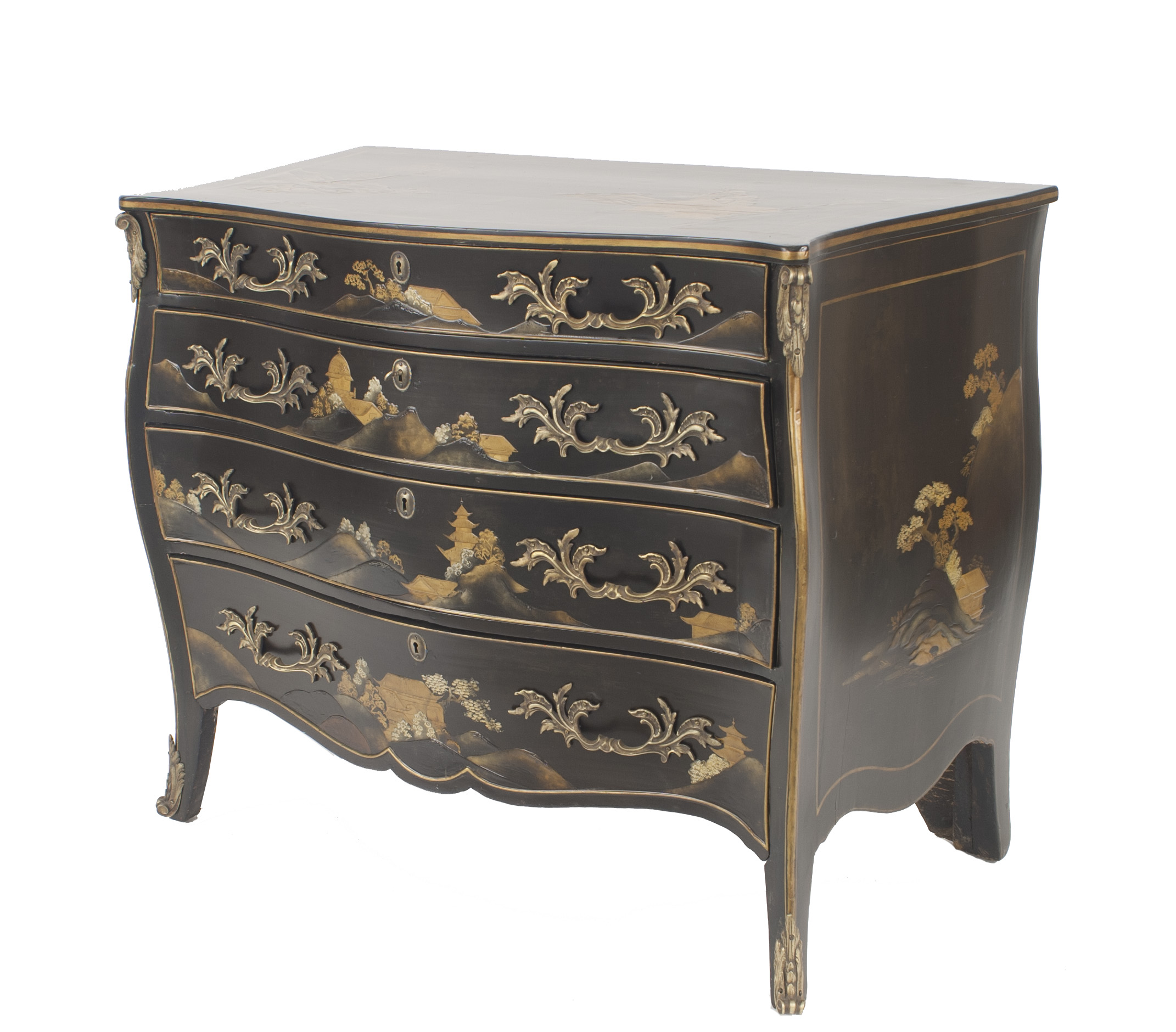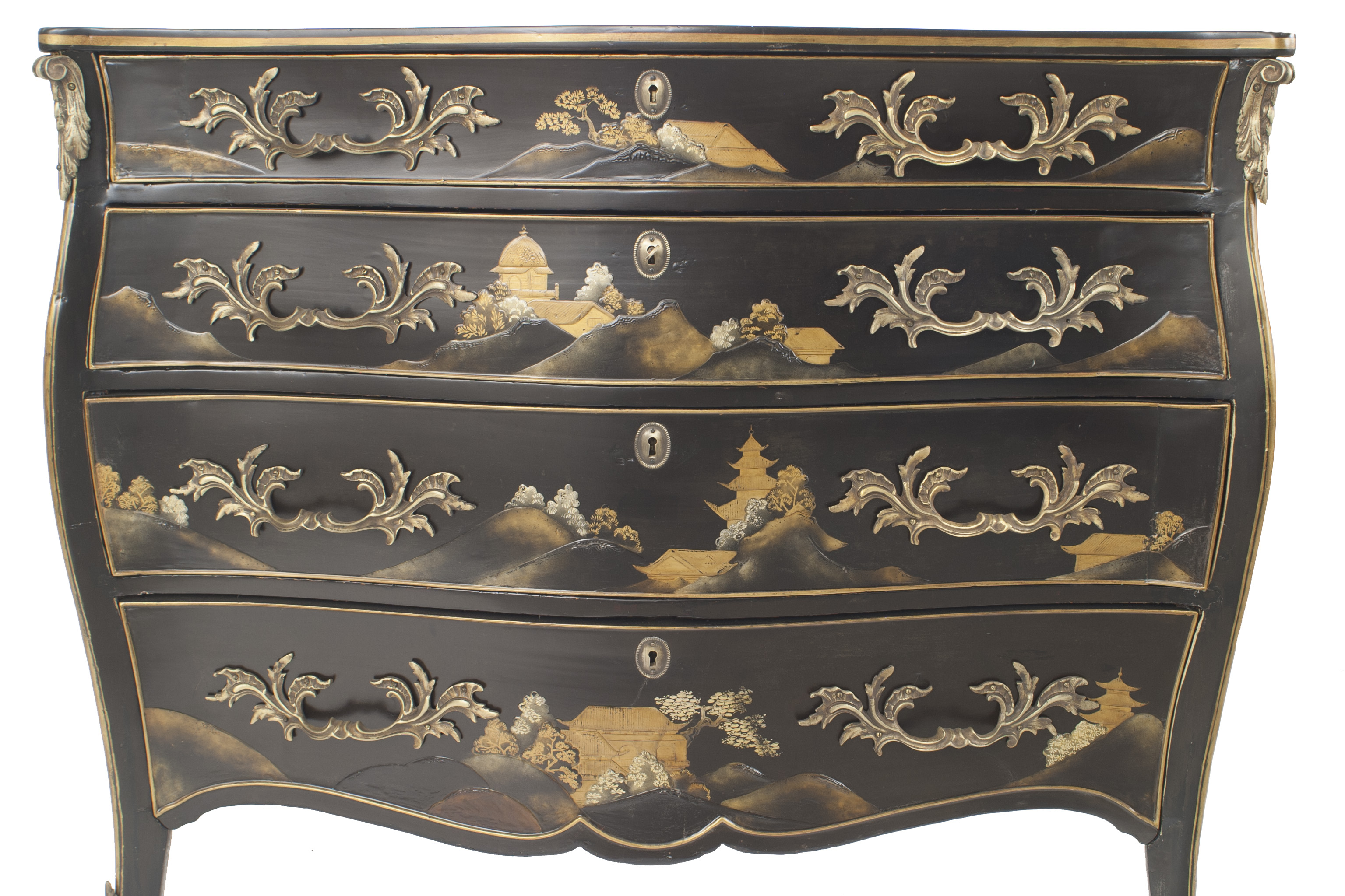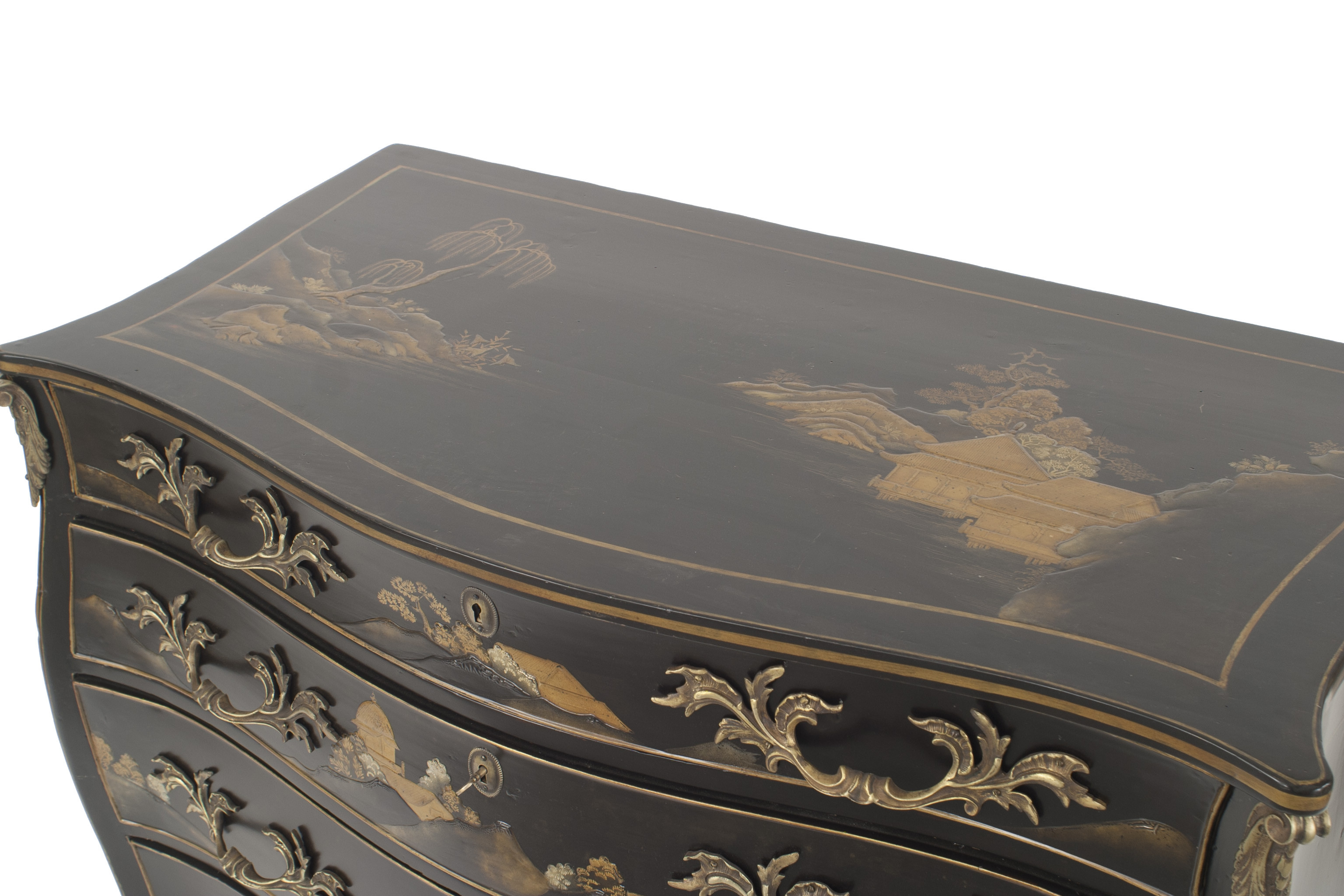 French Louis XV style (20th Century) black lacquered Chinoiserie decorated commode with a bombe shape and 4 drawers with bronze trim..