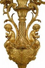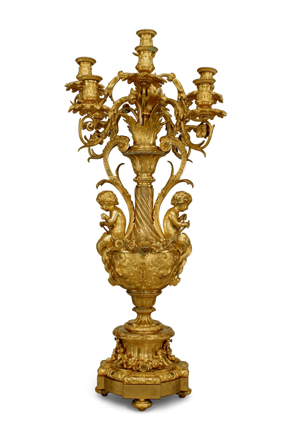 PAIR of French Louis XV-style (19th Century) bronze dore urn shaped 9 arm candelabra with scroll design arms and 2 cupids holding garlands. (PRICED AS PAIR)