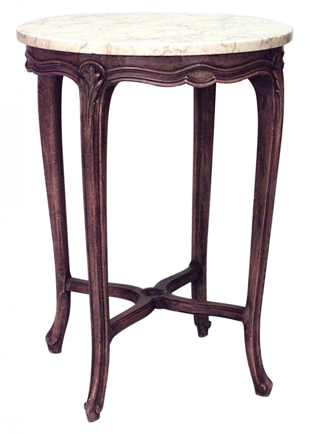 PAIR of French Louis XV-style (20th Century) provincial small walnut end tables with stretcher and beige marble top.