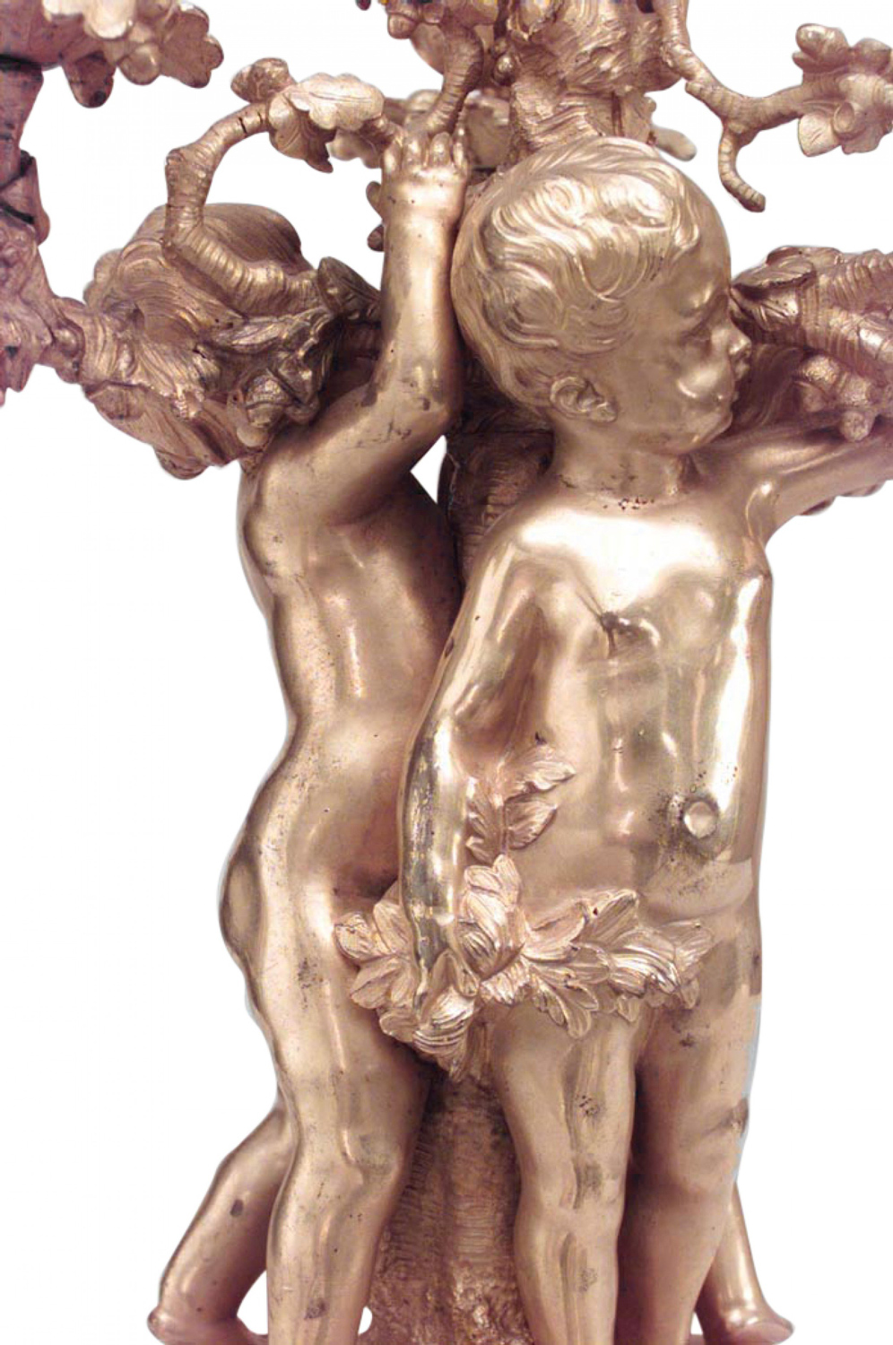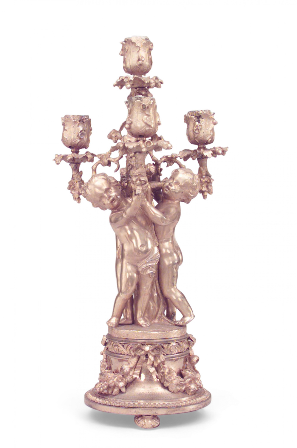 PAIR of French Louis XV-style (19th Century) bronze dore 4 arm candelabras with three cupids at the bases. (PRICED AS PAIR)