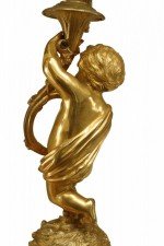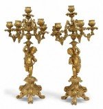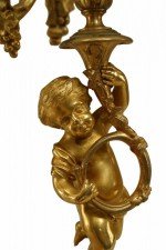 PAIR of French Louis XV-style (19th Century) bronze dore 5 arm candelabras with cupids playing horn instruments (PRICED AS PAIR).