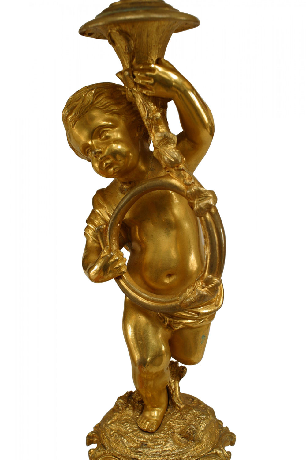 PAIR of French Louis XV-style (19th Century) bronze dore 5 arm candelabras with cupids playing horn instruments (PRICED AS PAIR)