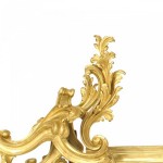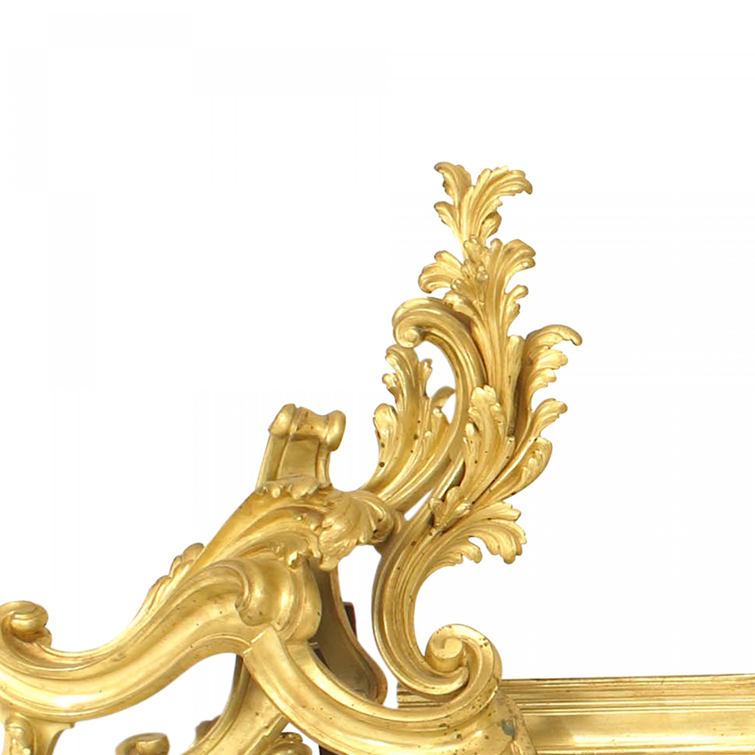 French Louis XV-style (19th Century) gilt bronze chenets & fire fender with scrolling foliate detail (chenets: 16¼"w x 6"d x 16¾"h).