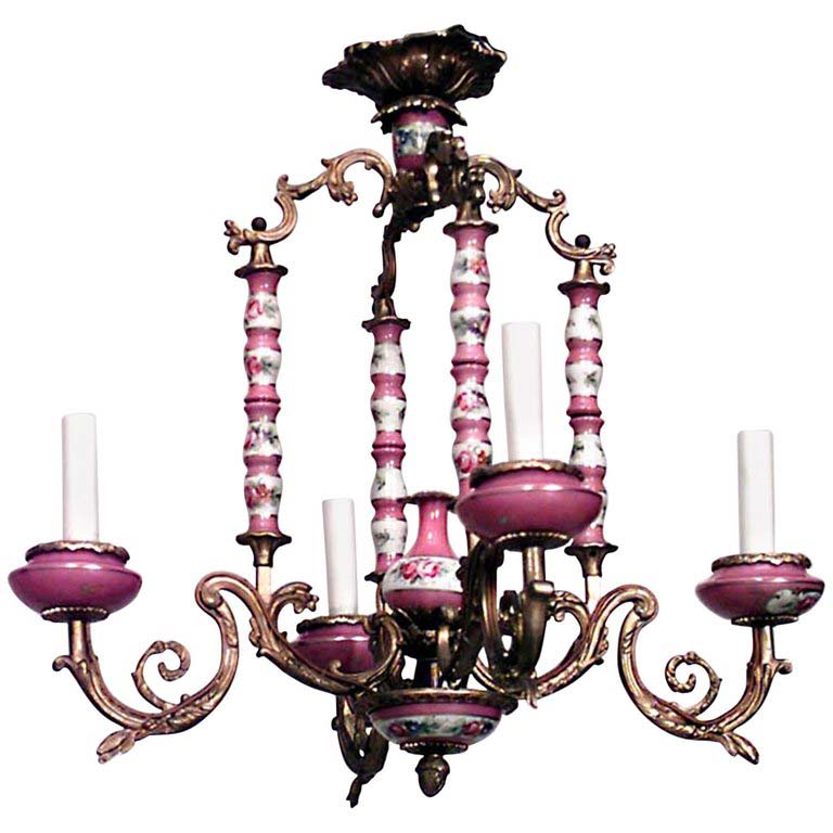 French Louis XV-style (19th Century) pink and white Sevres porcelain 4 arm chandelier with bronze dore trim.