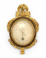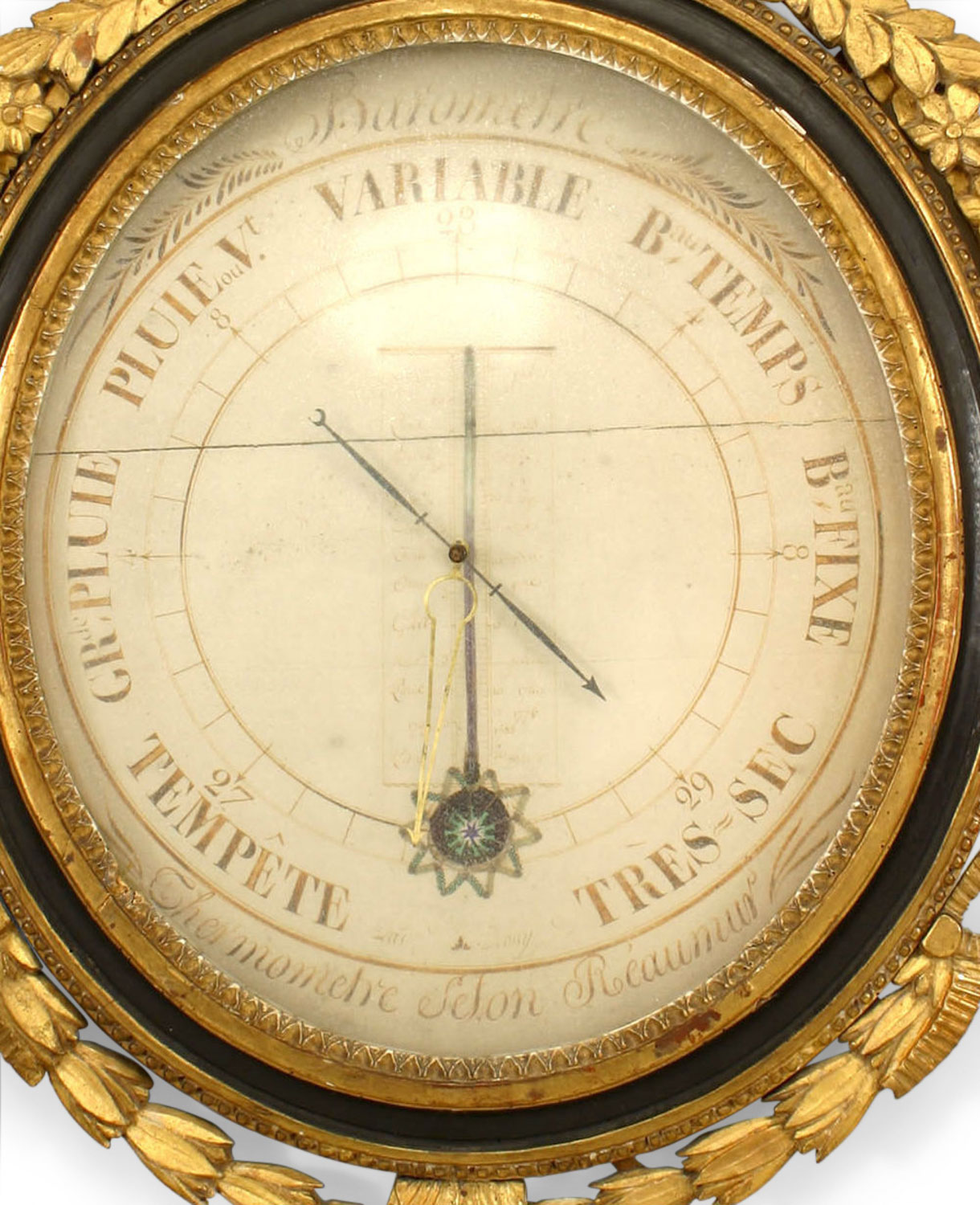 French Louis XVI (18th Century) barometer with original scientific illustrations and mercury vial framed with gilt foliate carvings & ebonized trim and a perched eagle pediment.