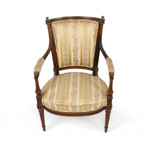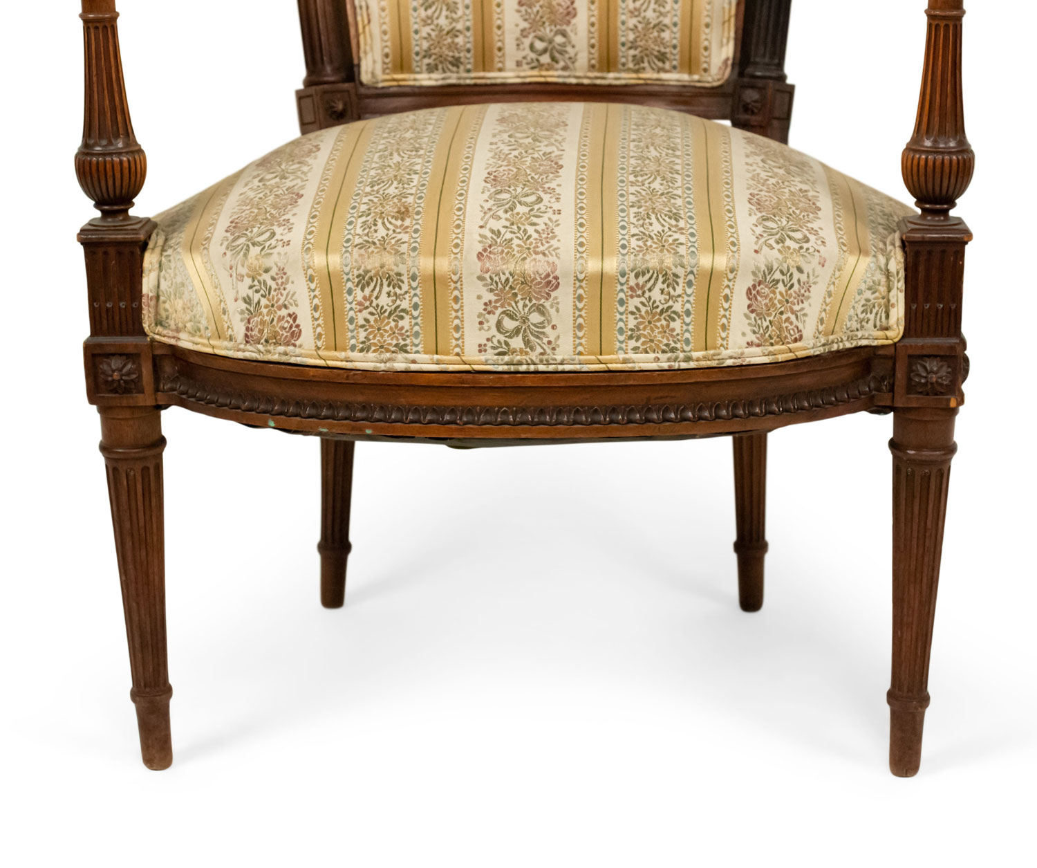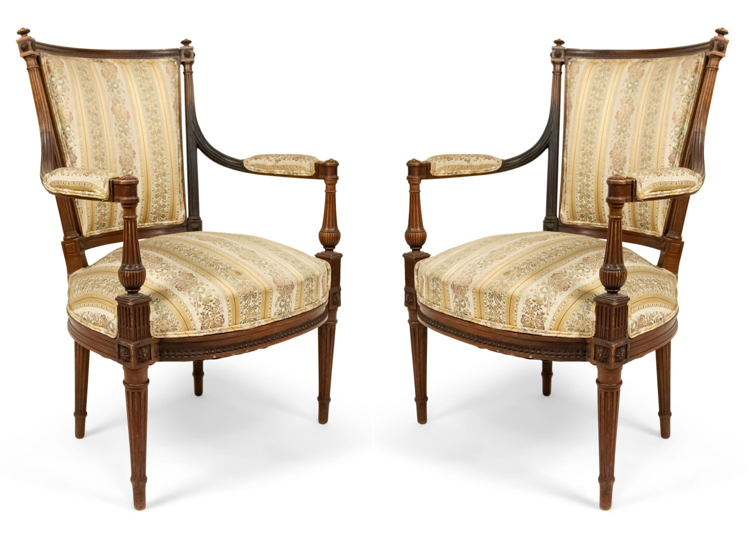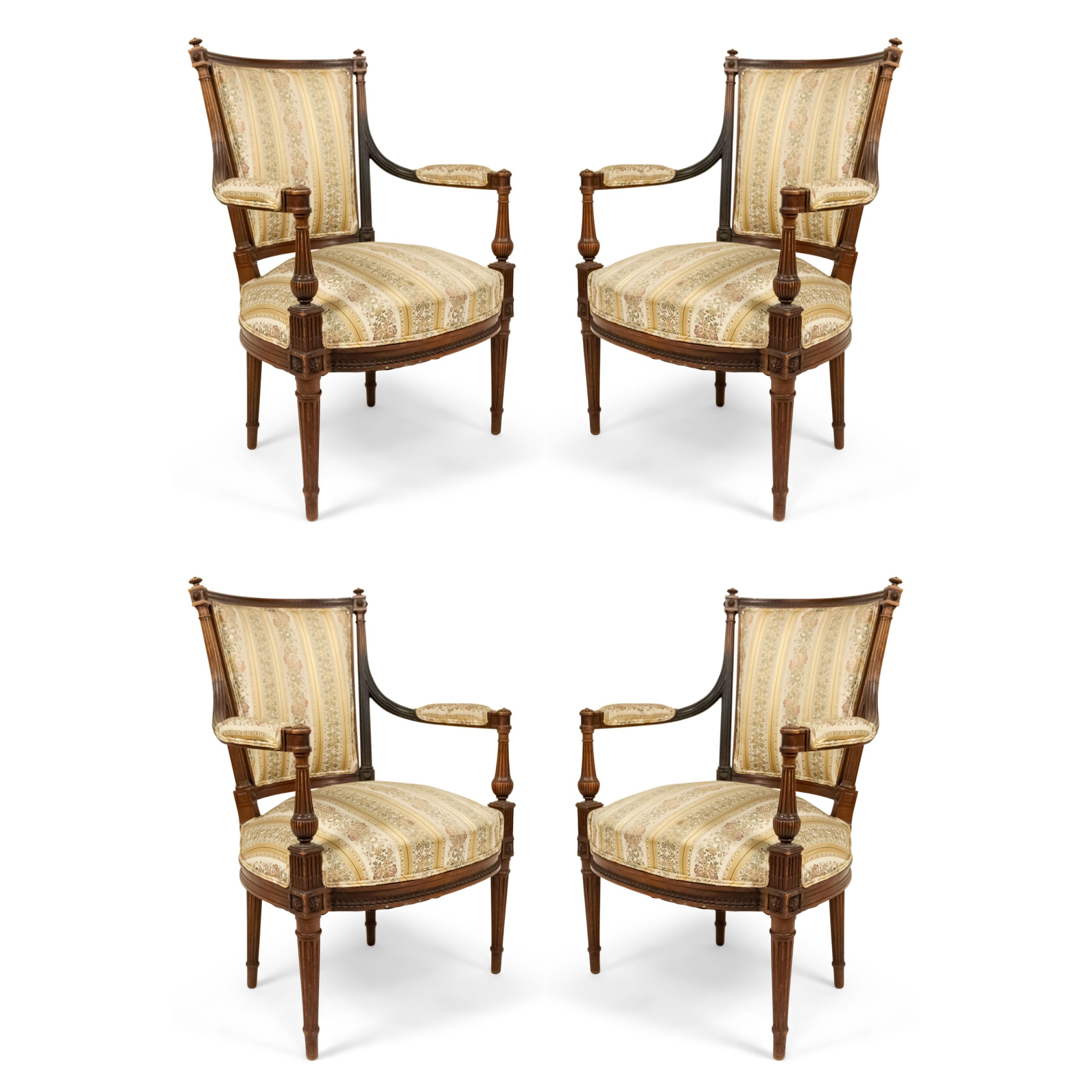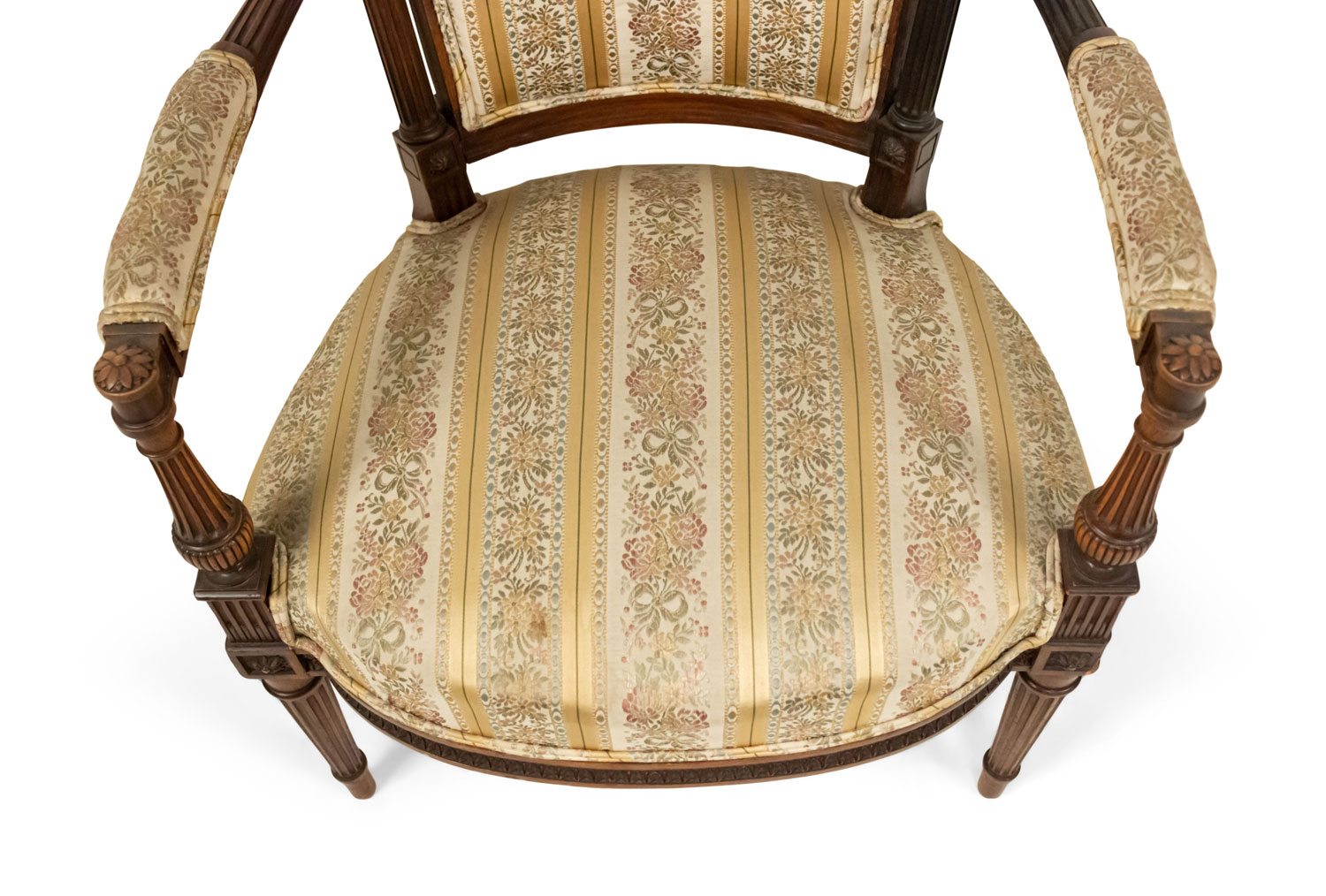 SET of 4 French Louis XVI style walnut arm chairs with striped upholstered seat and back. (19/20th Cent.)