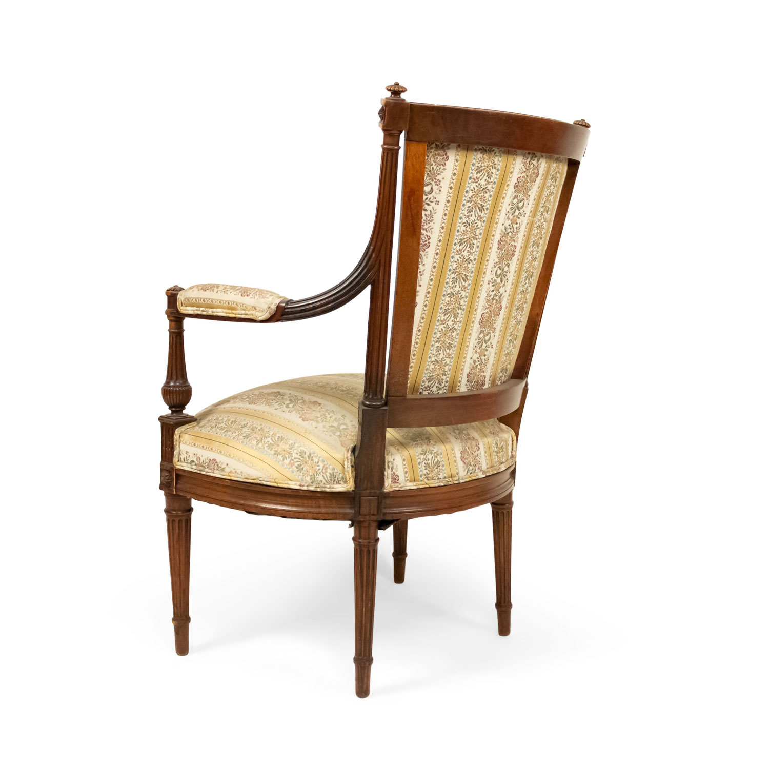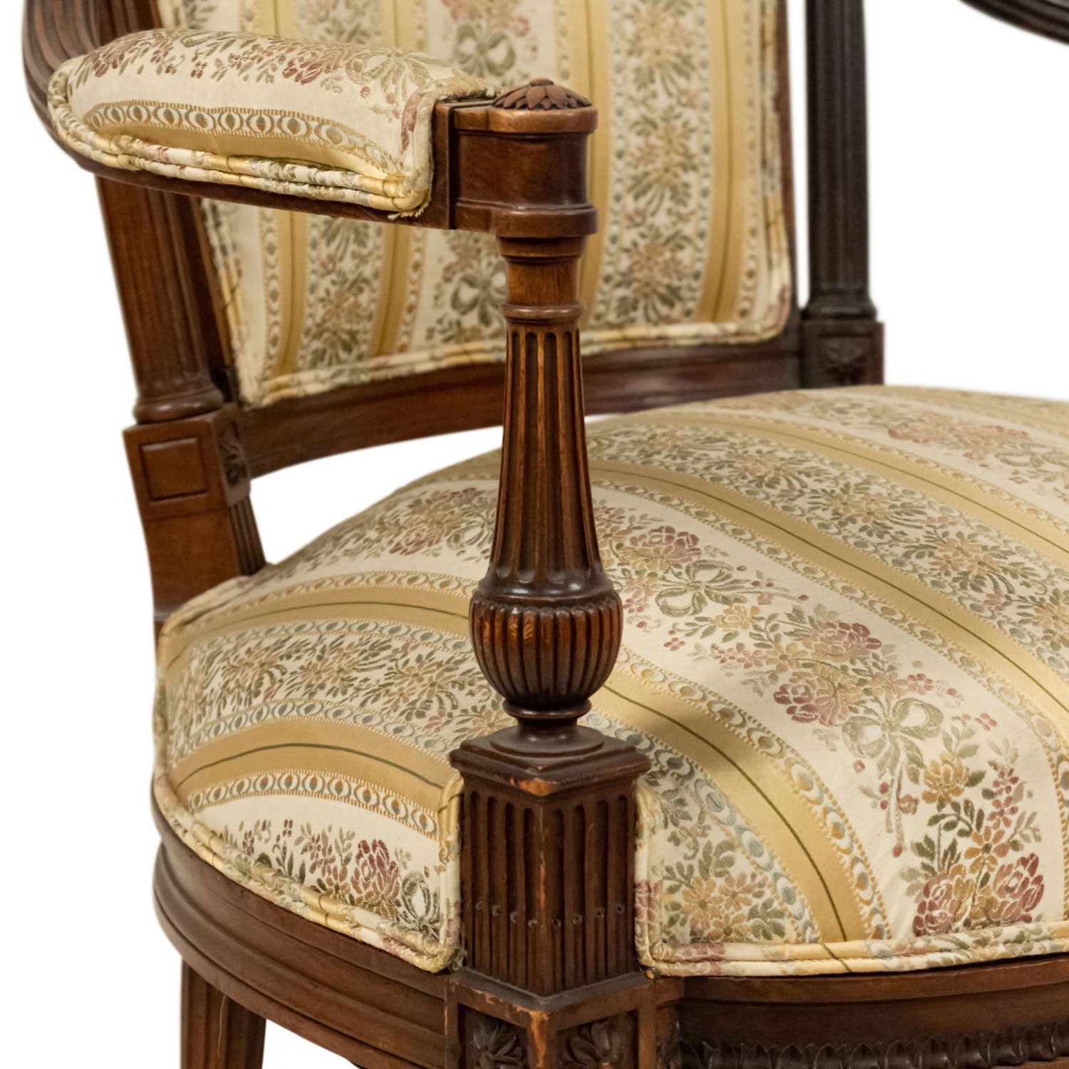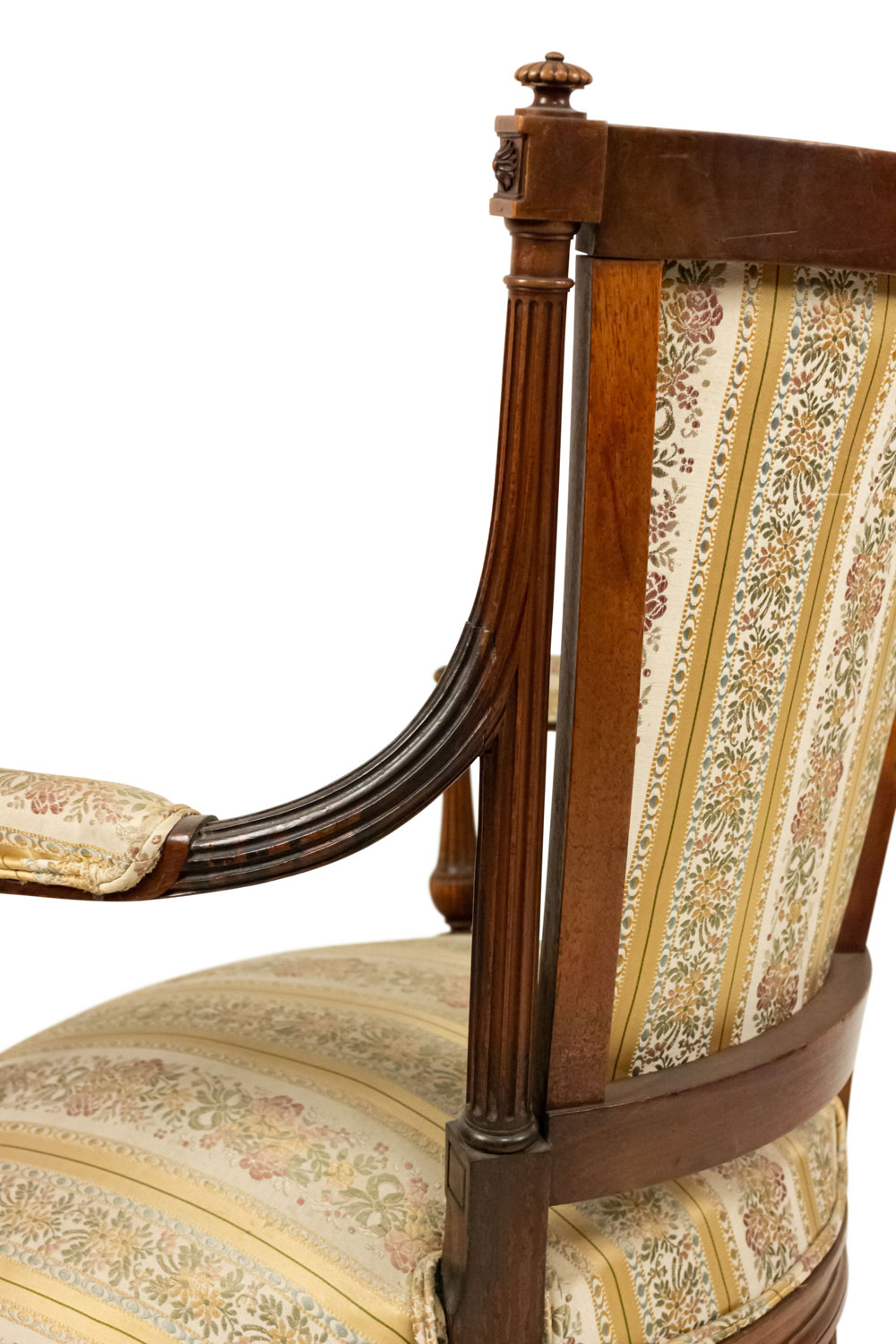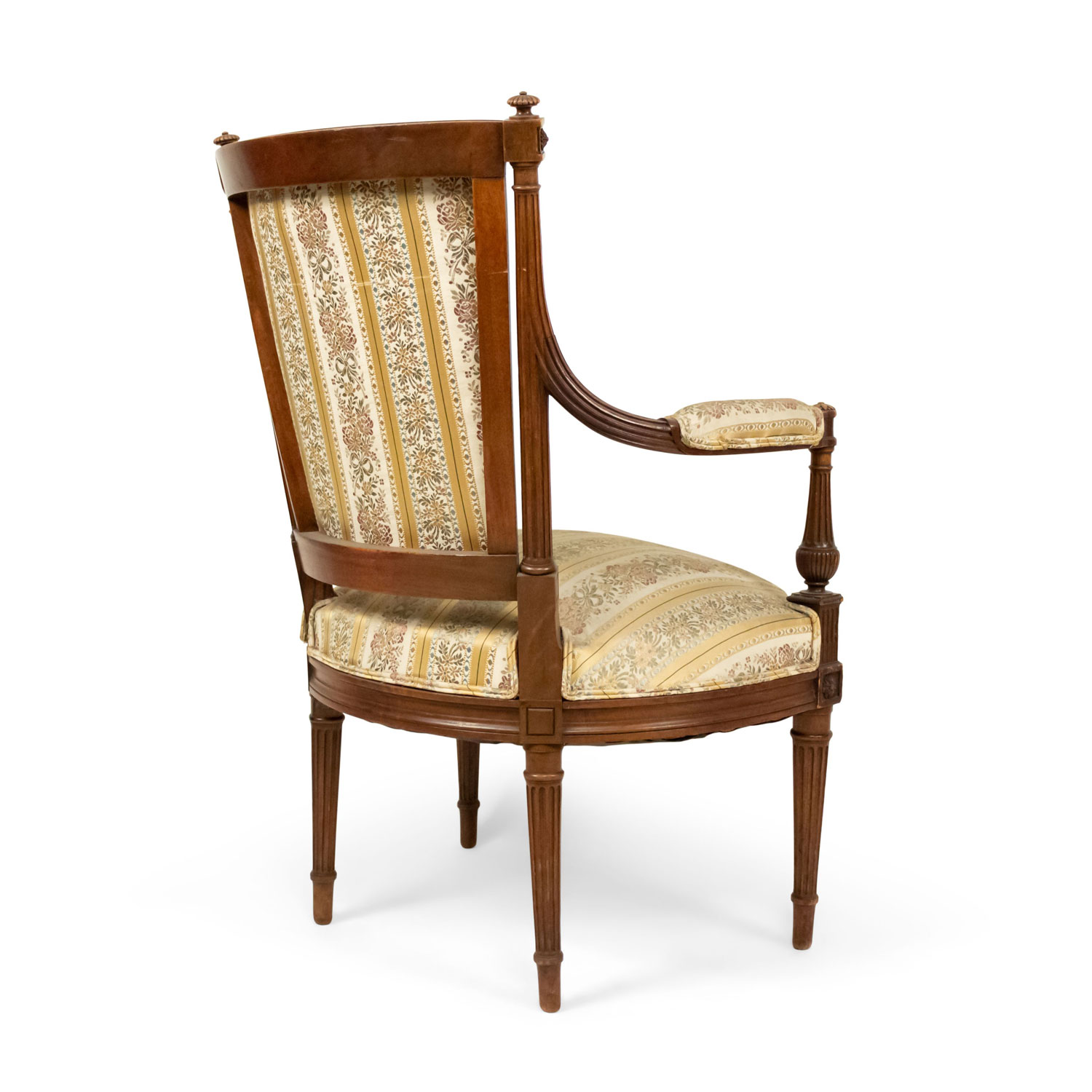 SET of 4 French Louis XVI style walnut arm chairs with striped upholstered seat and back. (19/20th Cent.)