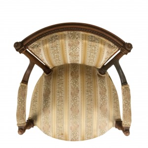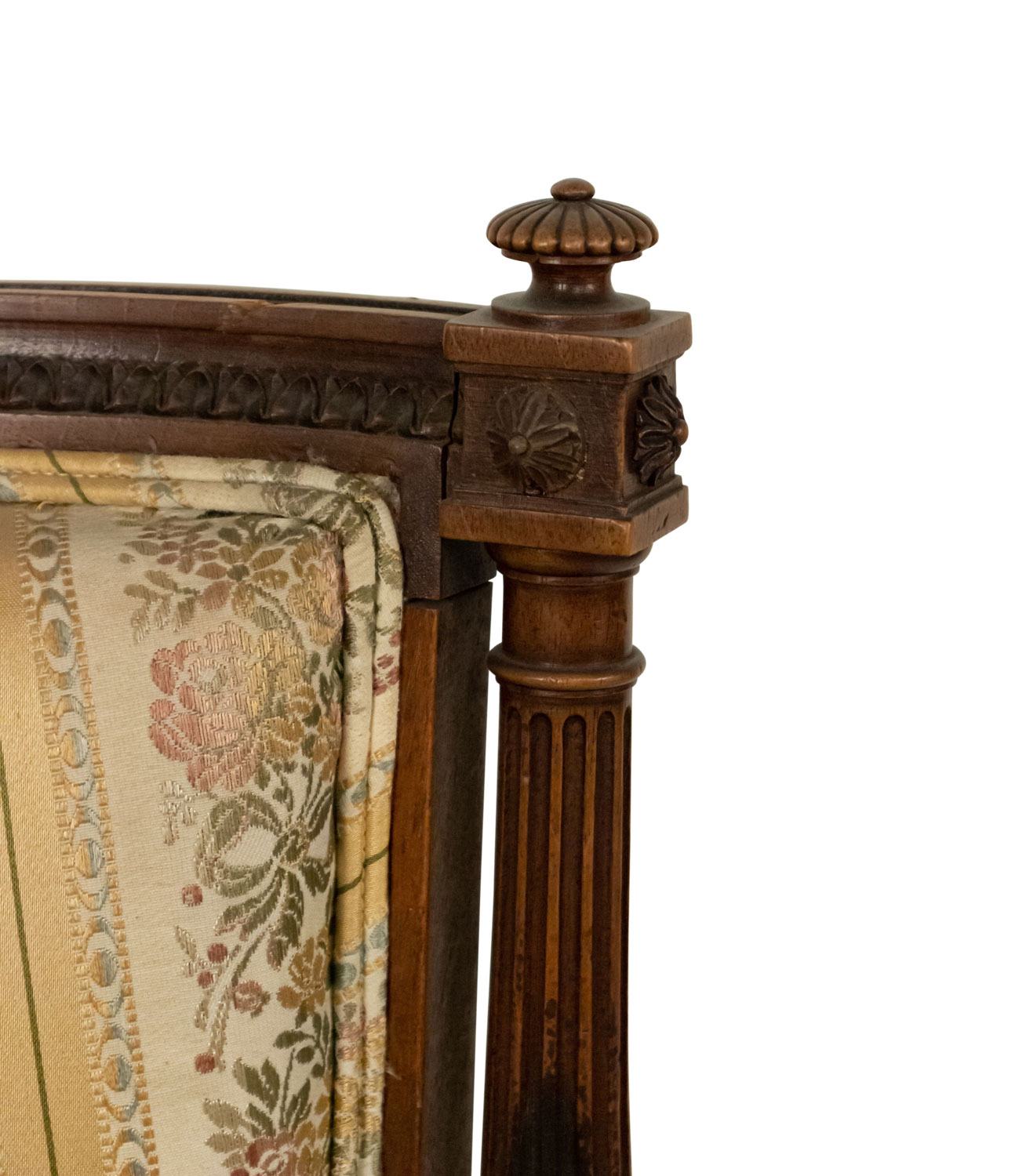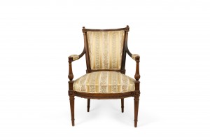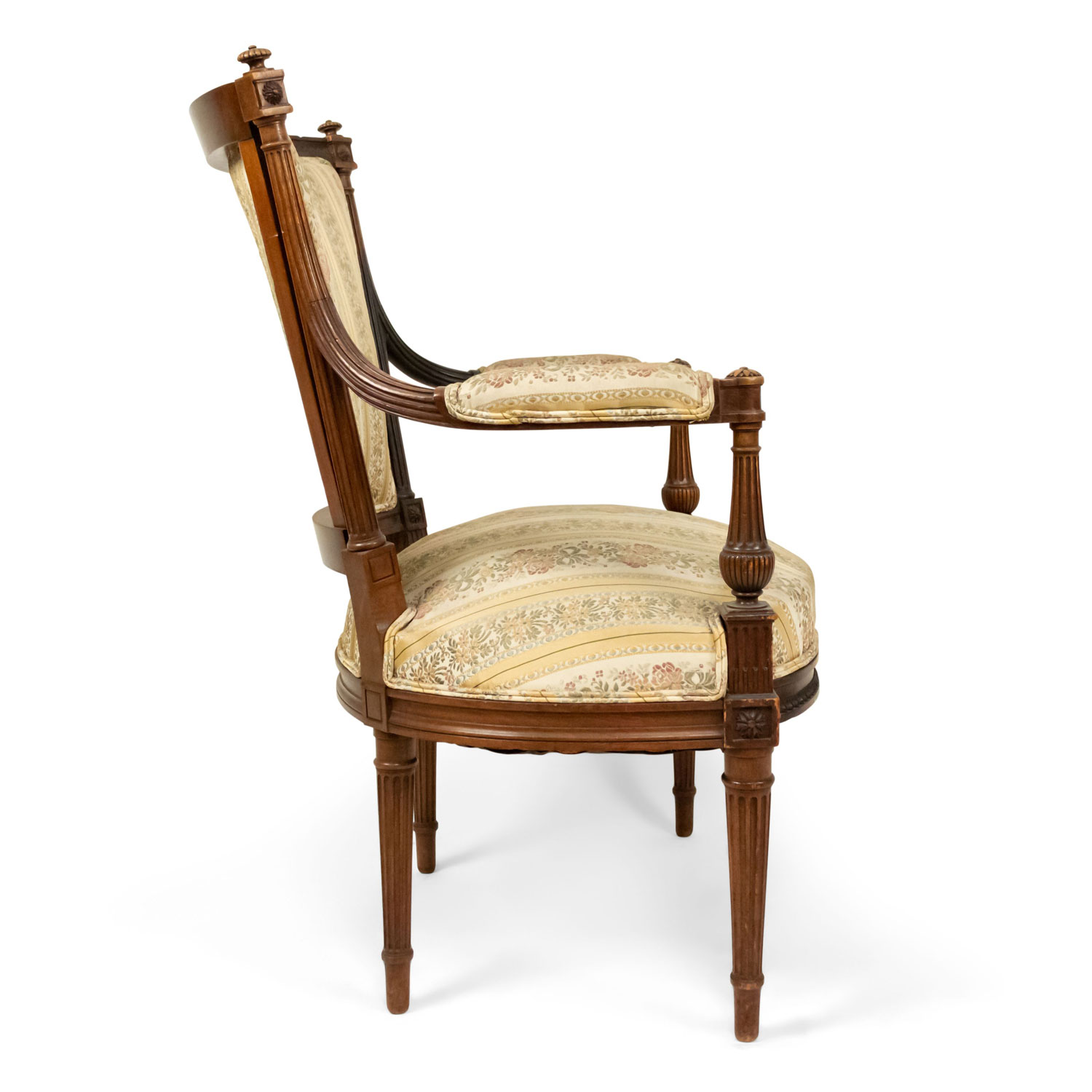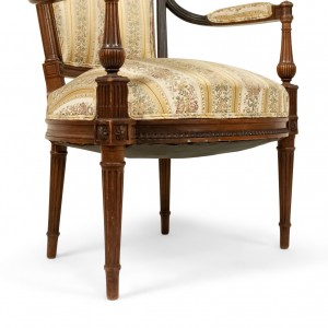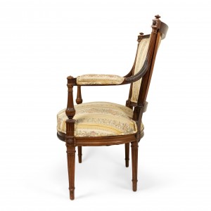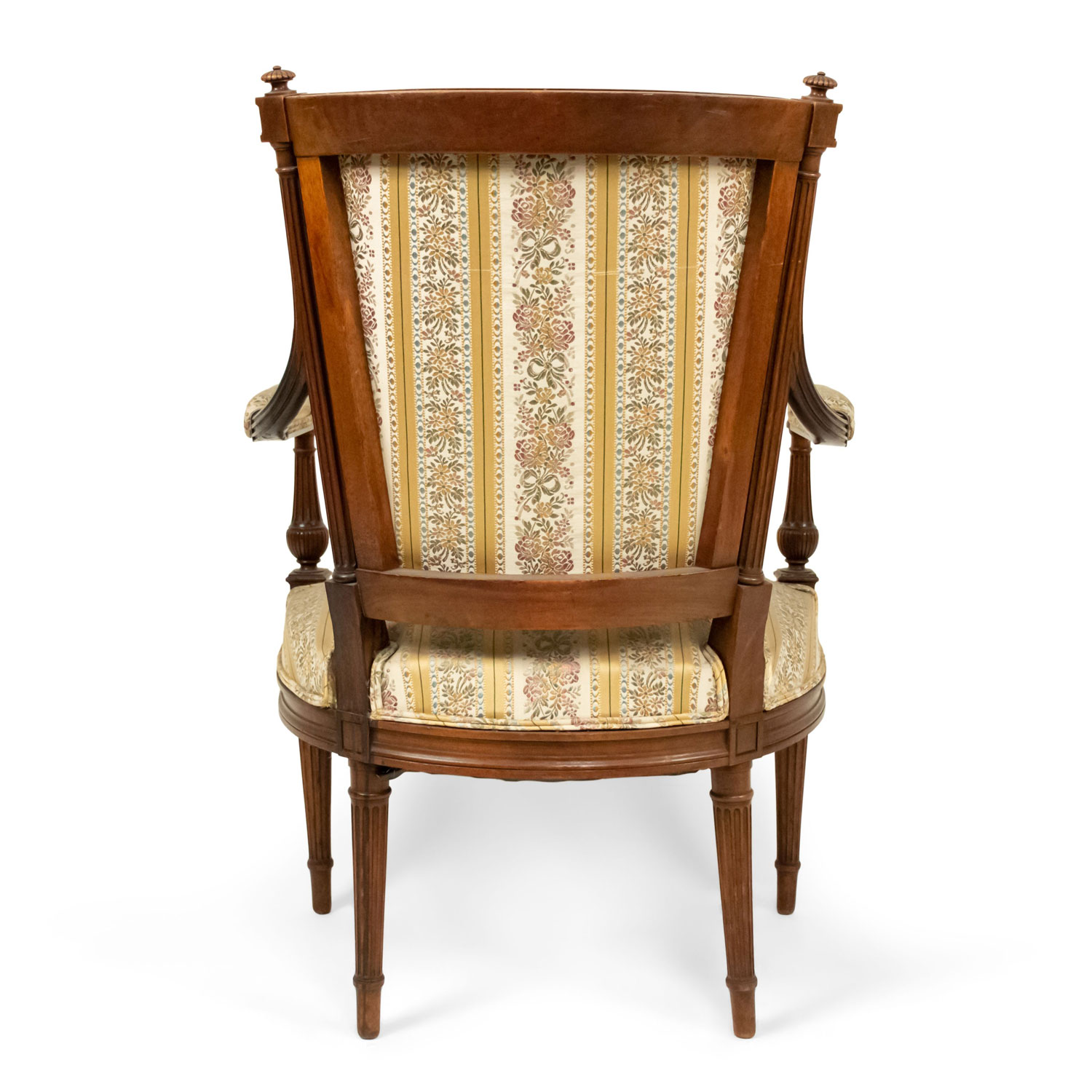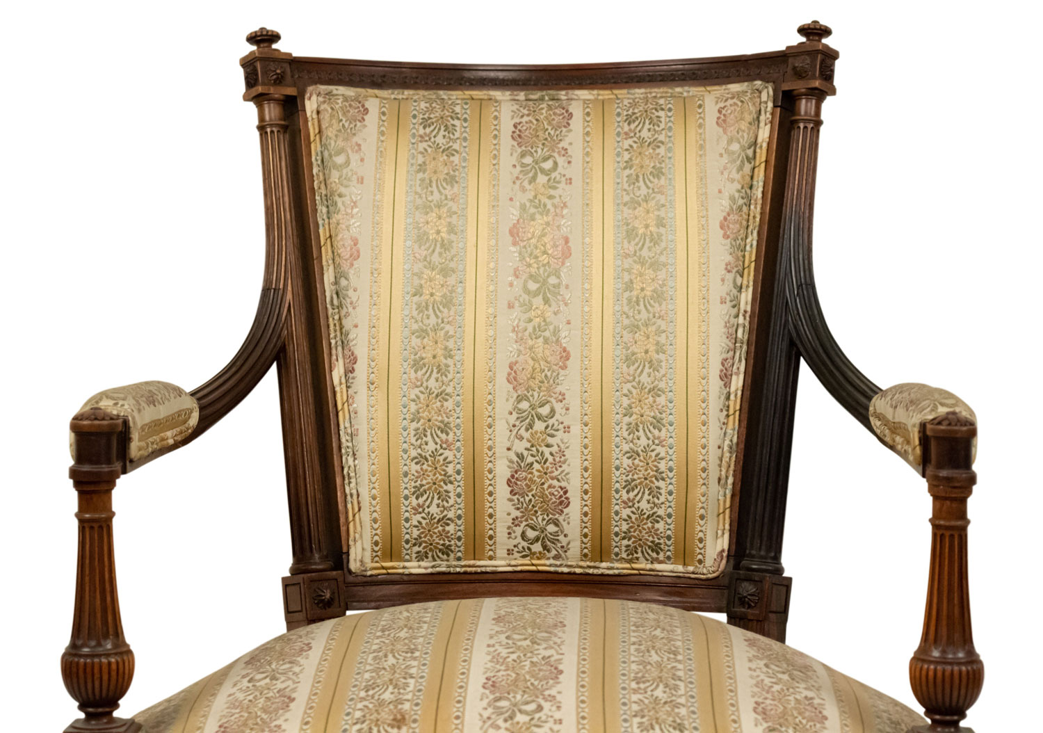 SET of 4 French Louis XVI style walnut arm chairs with striped upholstered seat and back. (19/20th Cent.)