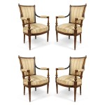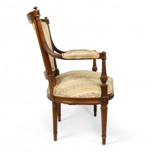 SET of 4 French Louis XVI style walnut arm chairs with striped upholstered seat and back. (19/20th Cent.).