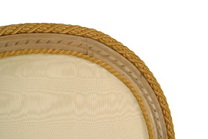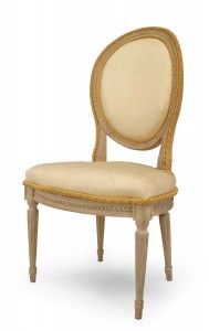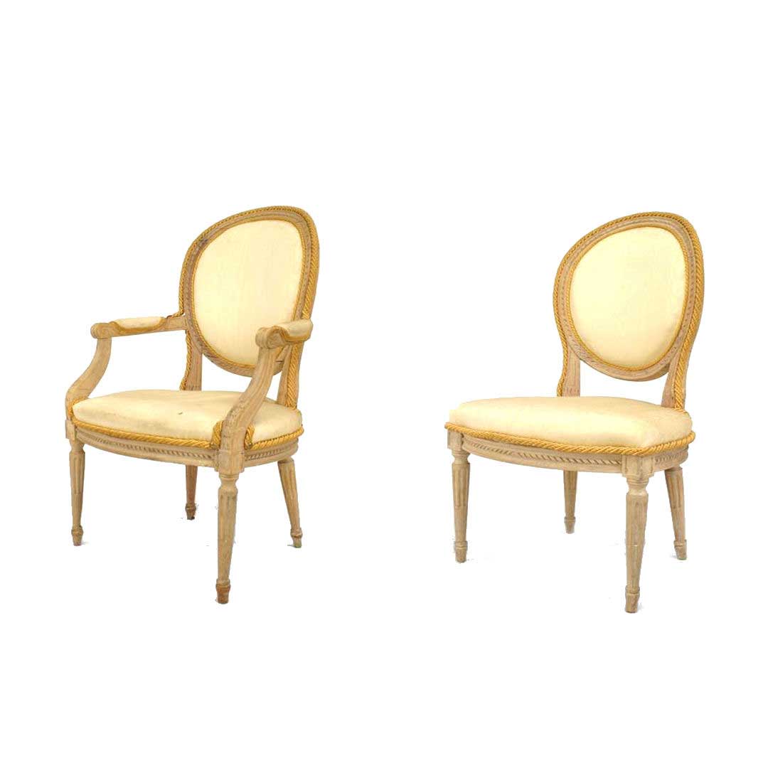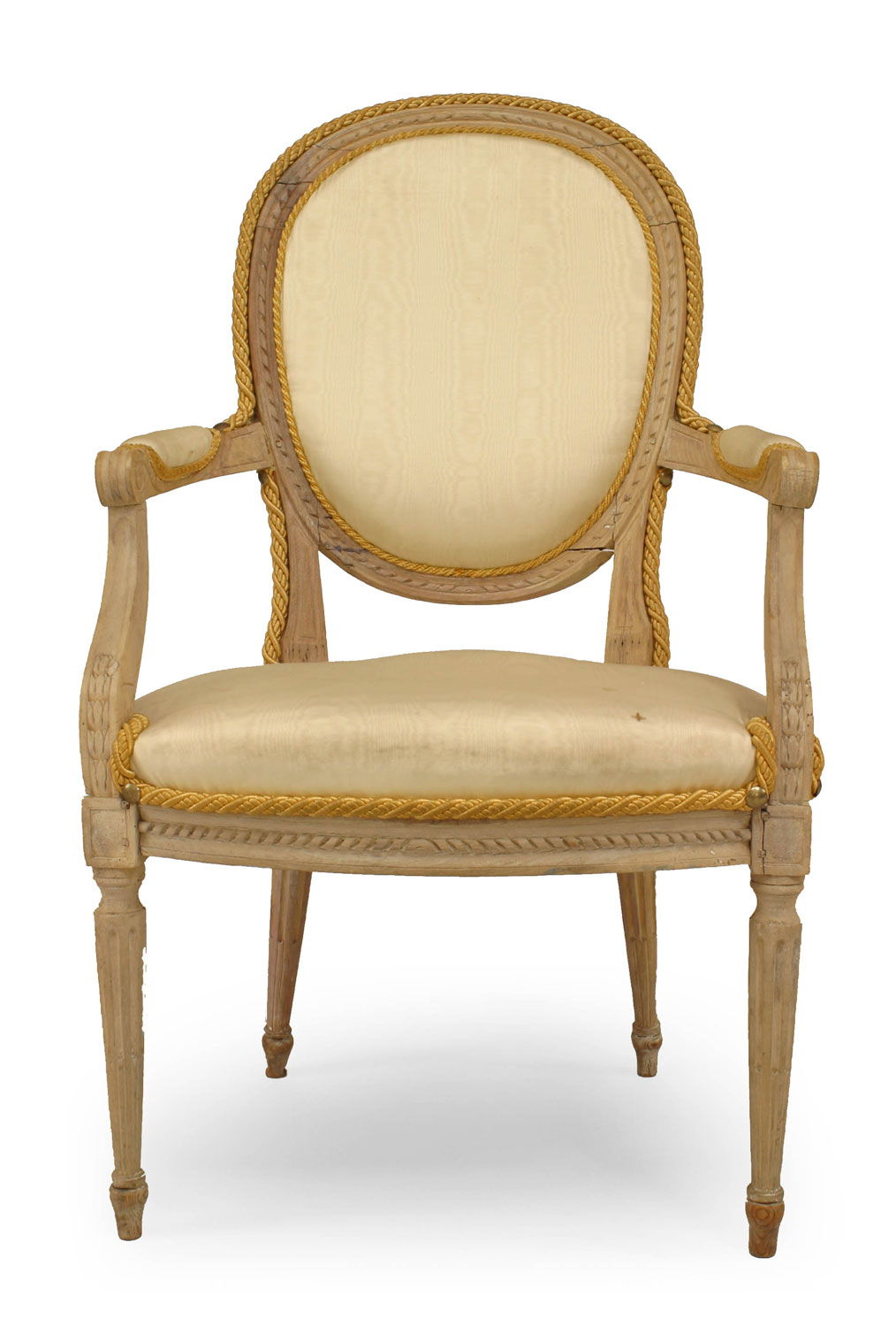 SET of 10 French Louis XVI stripped bleach dining chairs with white silk upholstered oval back & seat over fluted turned legs. 2 arm, 8 side chairs.(c.1775).
