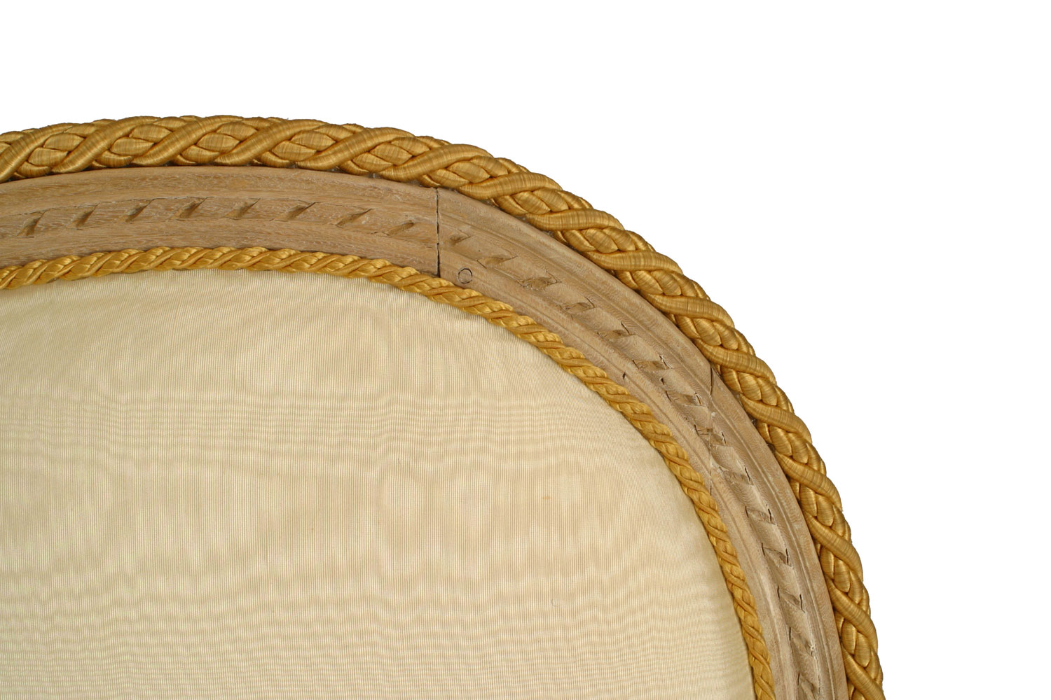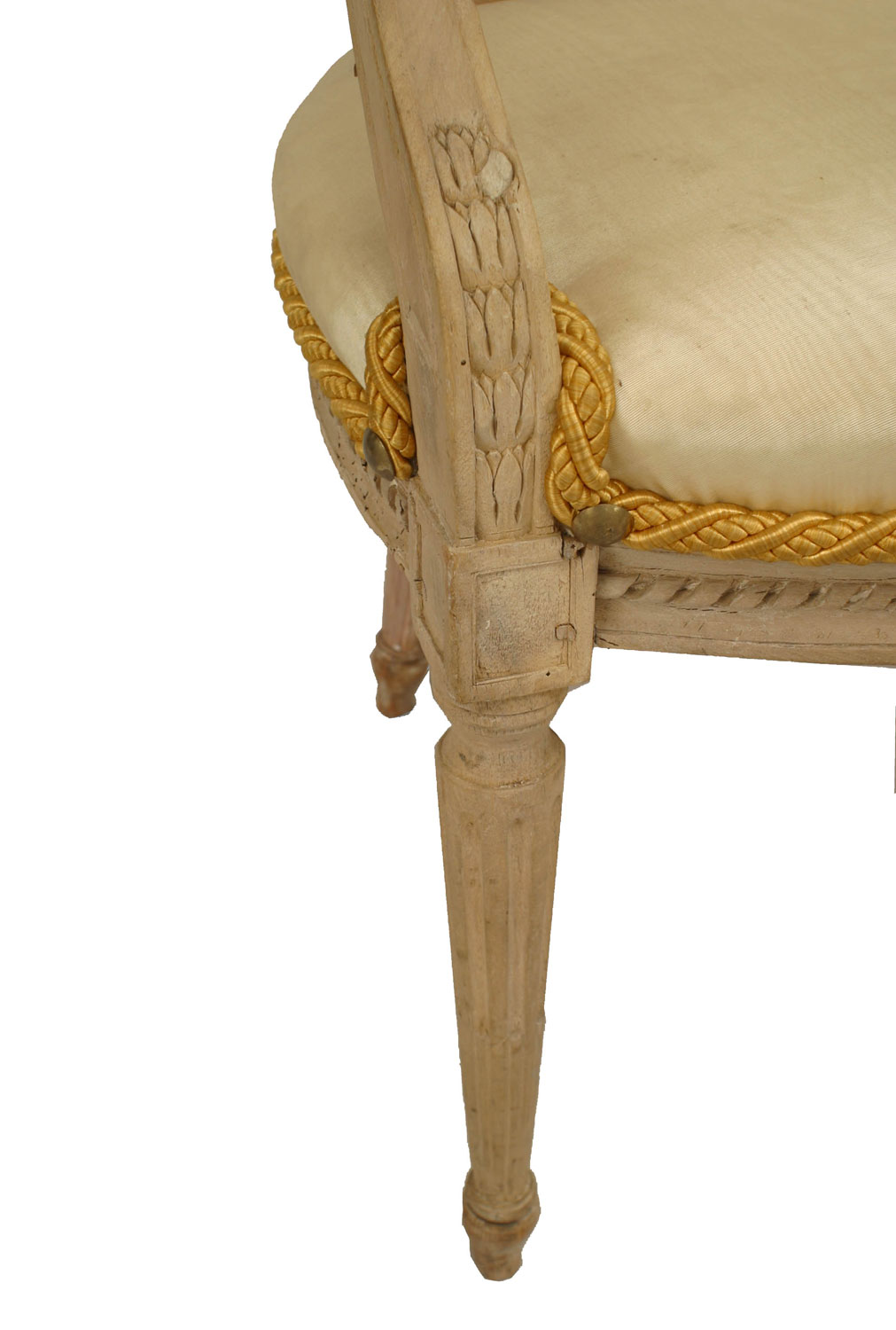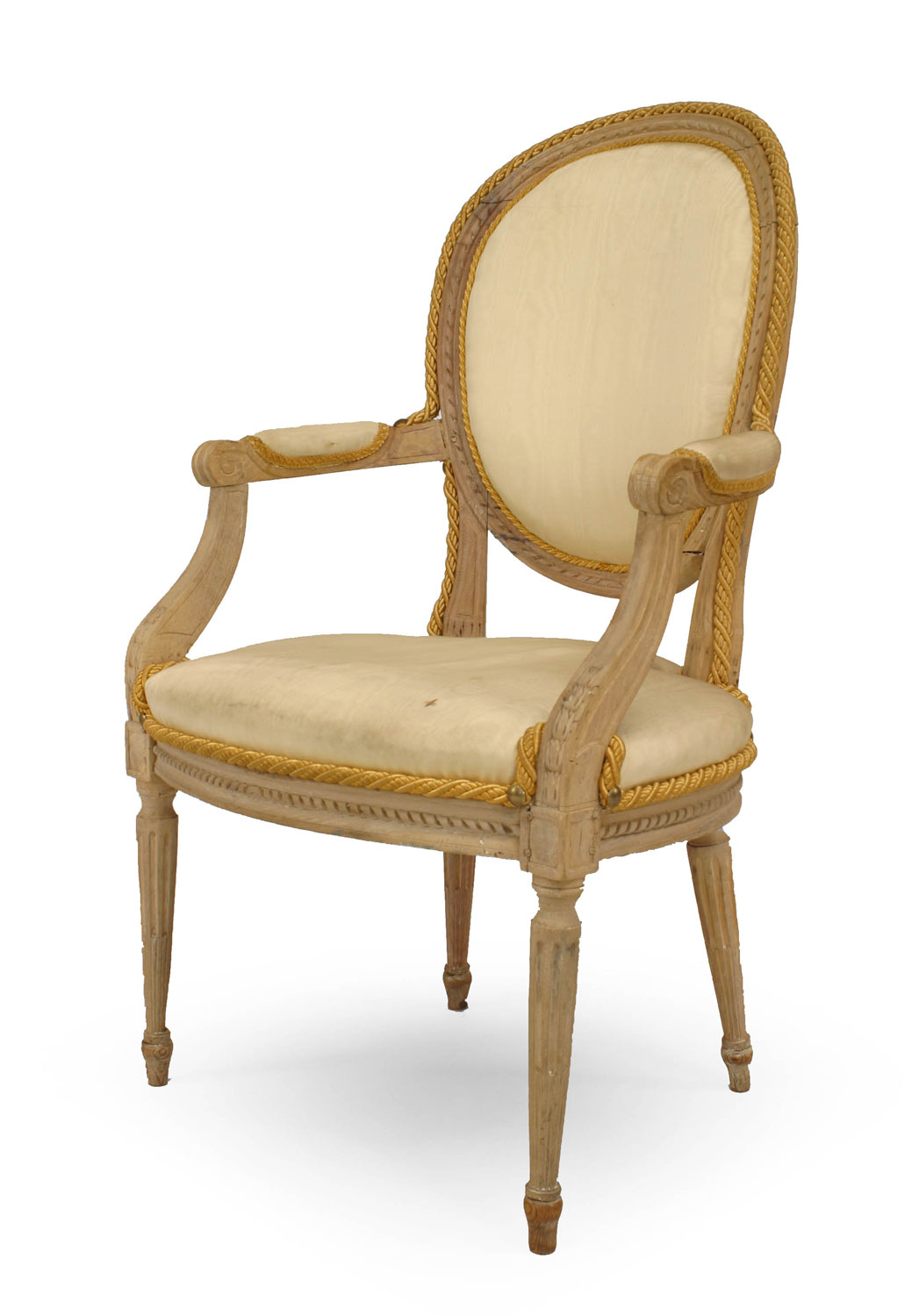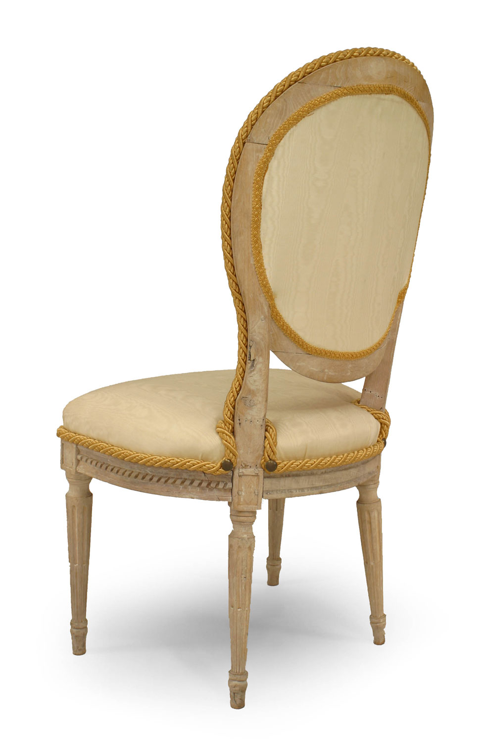 SET of 10 French Louis XVI stripped bleach dining chairs with white silk upholstered oval back & seat over fluted turned legs. 2 arm, 8 side chairs.(c.1775)