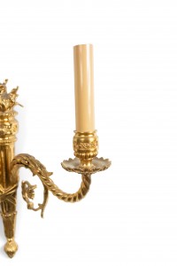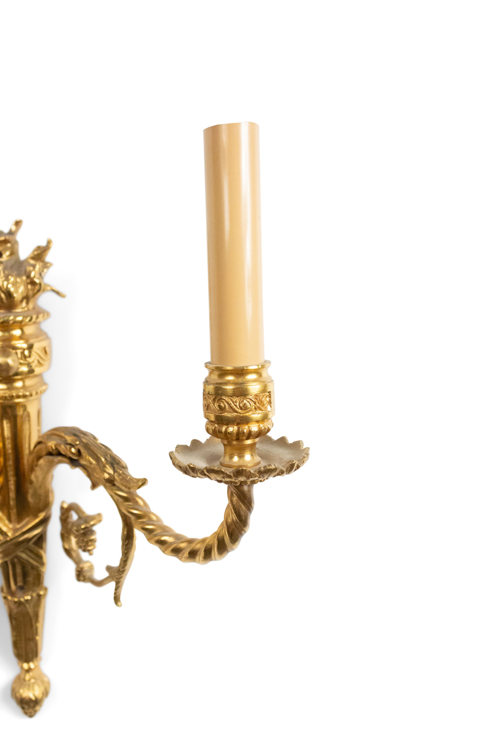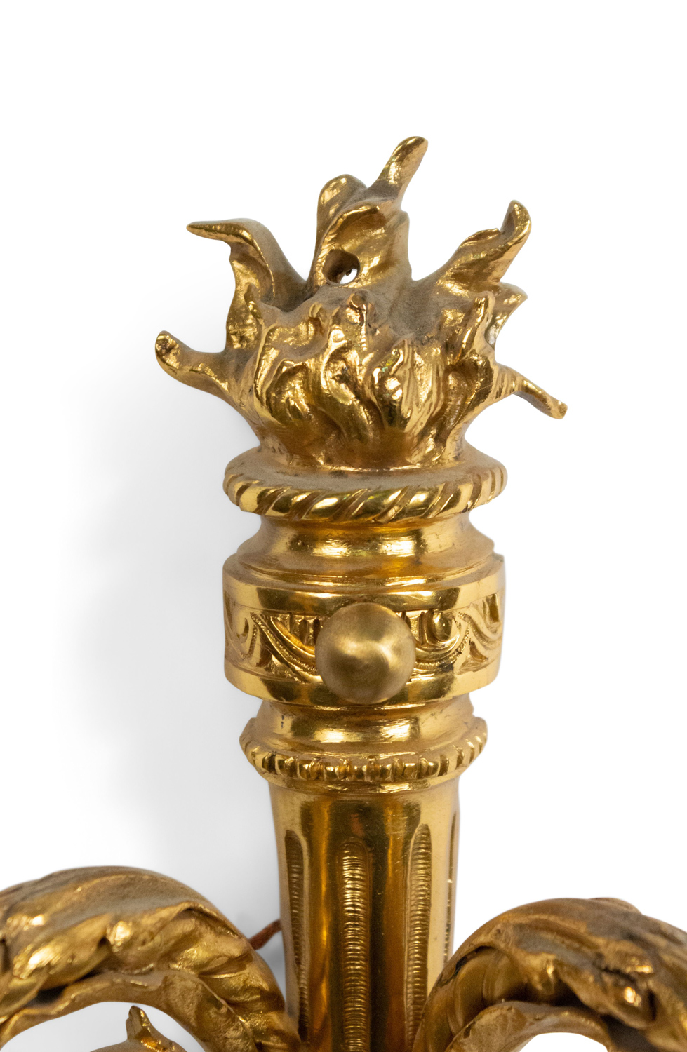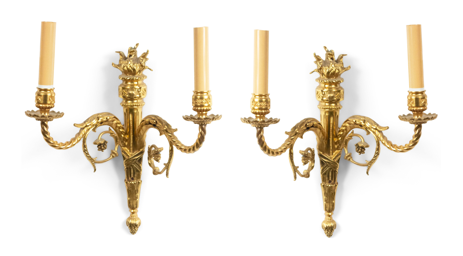 PAIR of French Louis XVI-style (19/20th Century) bronze dore wall sconces with two scroll arms and a torch design (PRICED AS PAIR)