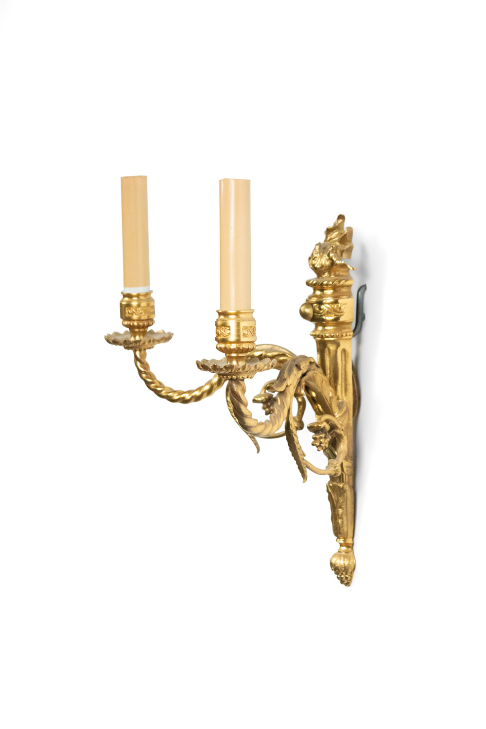 PAIR of French Louis XVI-style (19/20th Century) bronze dore wall sconces with two scroll arms and a torch design (PRICED AS PAIR).