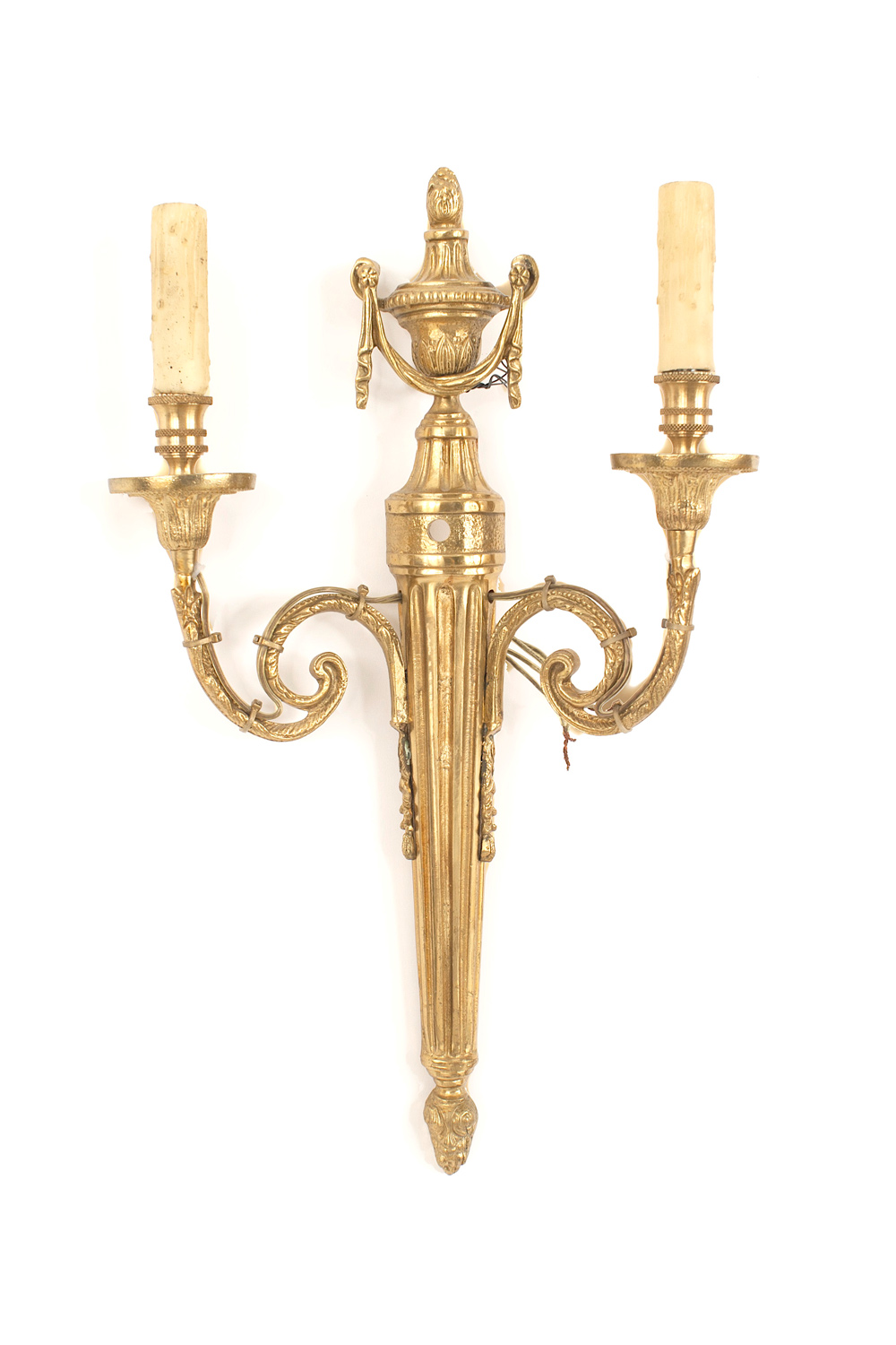 French Louis XVI-style (20th Century) gilt bronze wall sconce with fluted design, two scroll arms, and an urn and swag finial top..