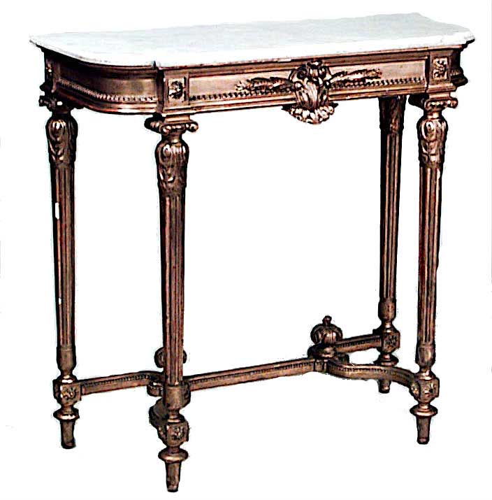 French Louis XVI-style (19th Century) gilt console table with double finial stretcher and white marble top..