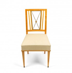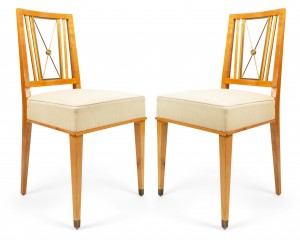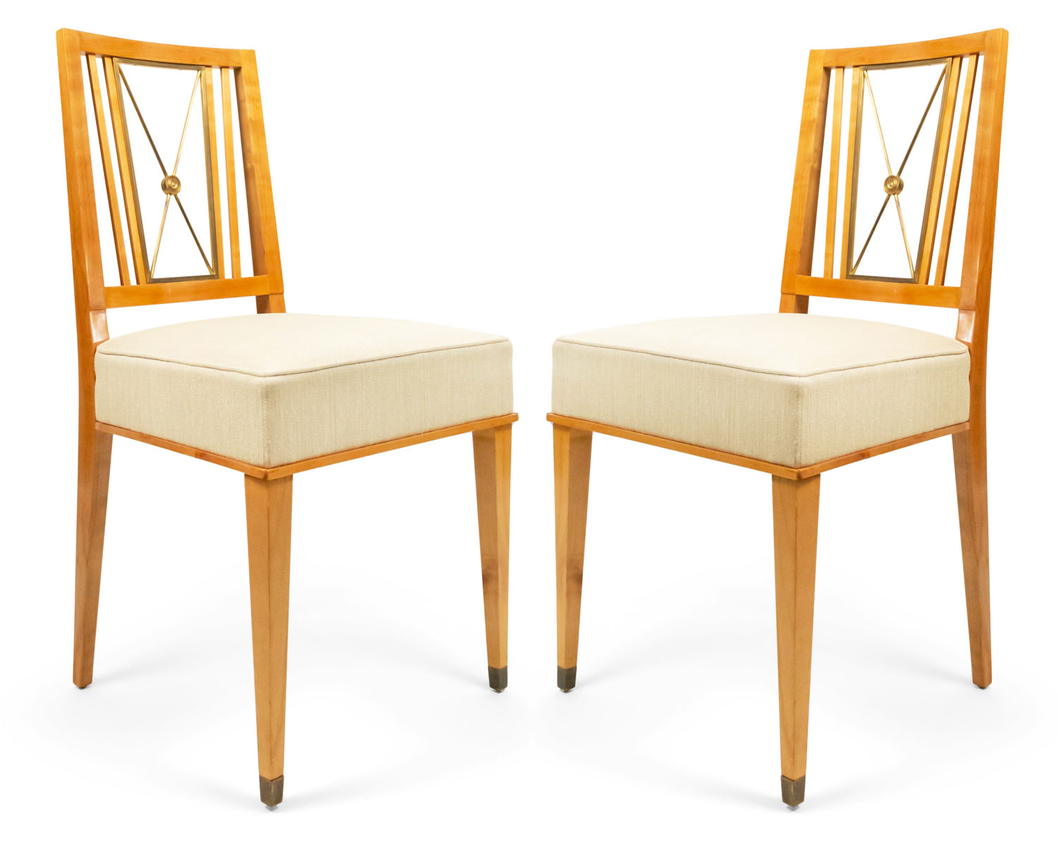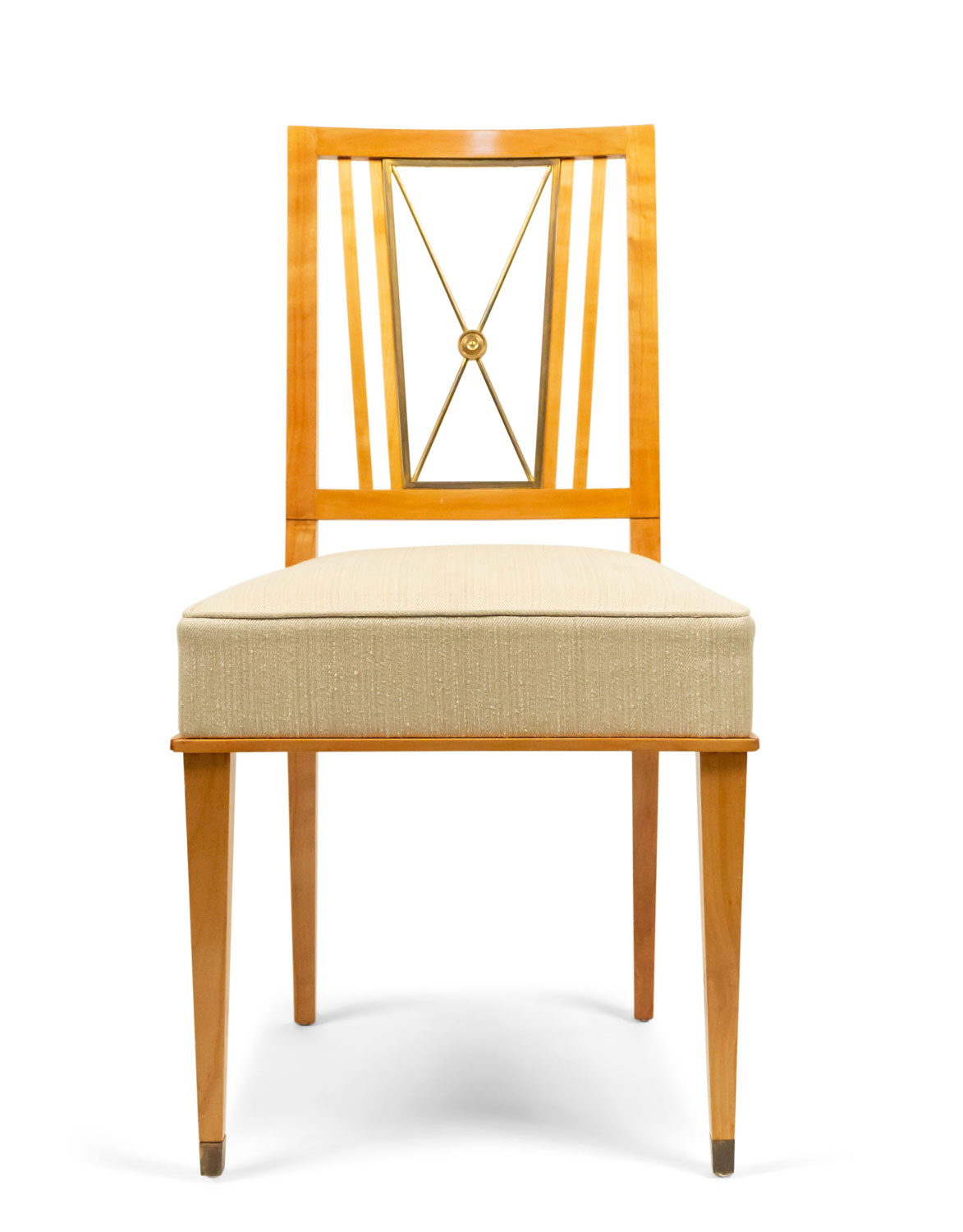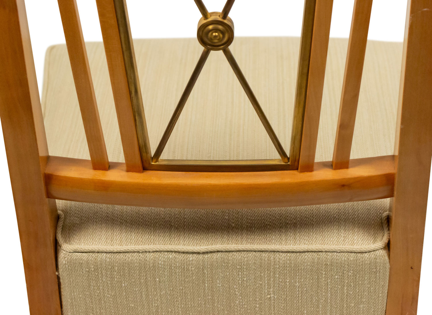 SET of 4 French (1940s) brass & maple side chairs with X form open backs above tan silk upholstered seats. (attributed to: JACQUES ADNET)(PRICED AS SET)(8 Similar chairs in pink: 059091A)