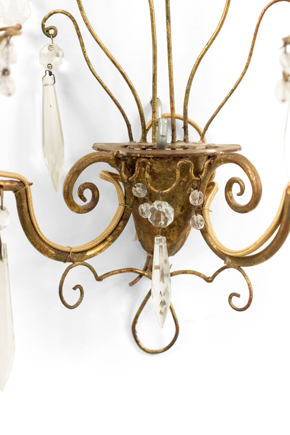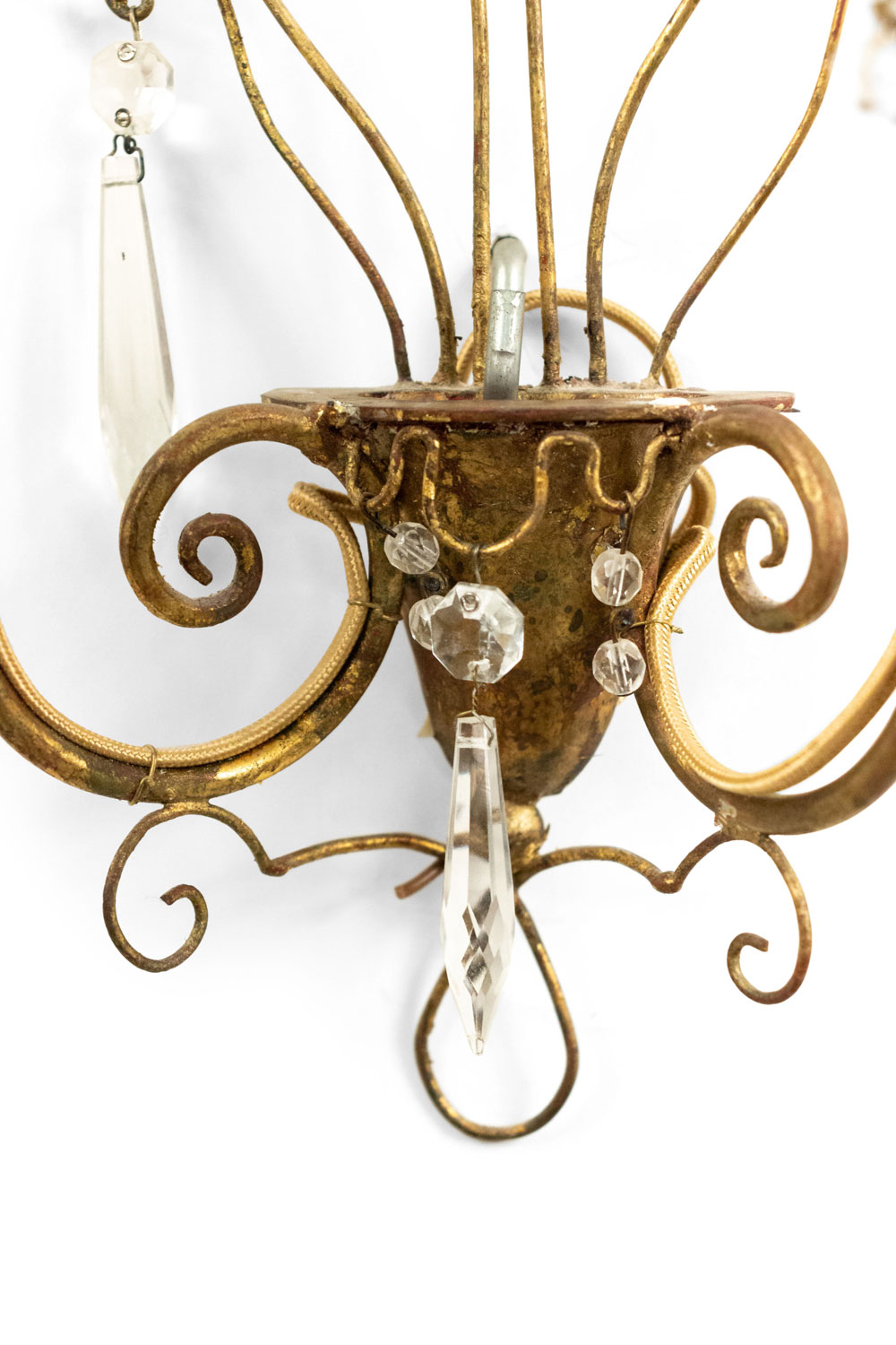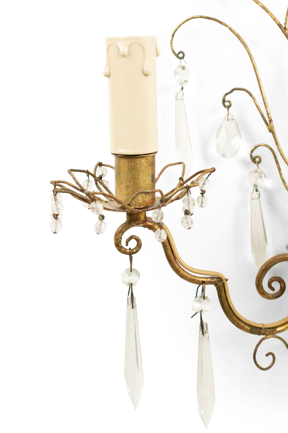 PAIR of French Mid-Century (1940's) gilt metal wall sconces with scroll wire design and crystal trim with 2 scroll design arms and filigree bobeche. (att: BAGUES) (PRICED AS PAIR)