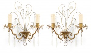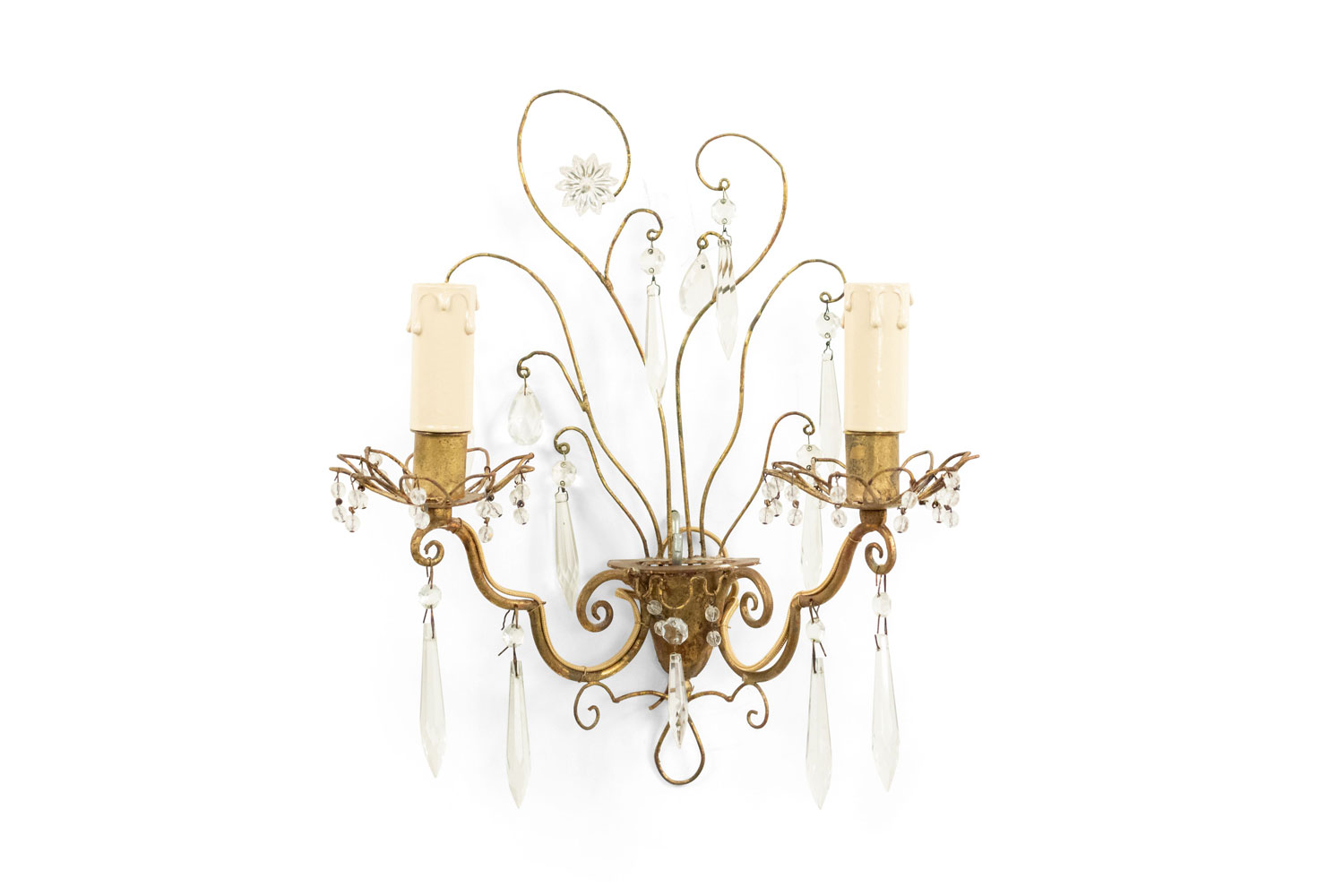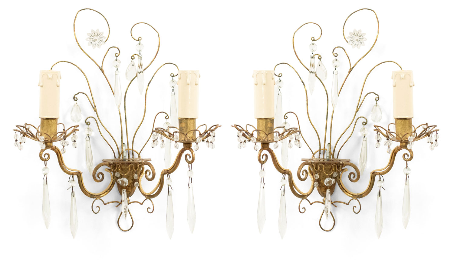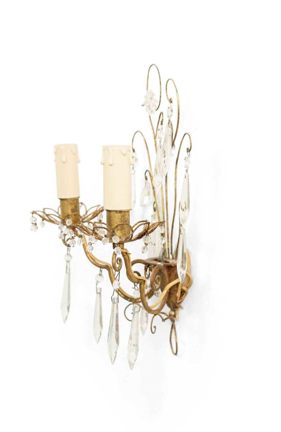 PAIR of French Mid-Century (1940's) gilt metal wall sconces with scroll wire design and crystal trim with 2 scroll design arms and filigree bobeche. (att: BAGUES) (PRICED AS PAIR)