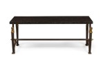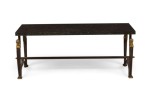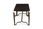 French Mid-Century (1940s) Maison Bagues coffee table having rectangular black marble tops over wrought iron bases with four legs bearing a gilded horse head motif finials and an arrow design stretcher (Provenance: Barry Friedman Sale-Sotheby's NY, 12/17/2004 Lots 140 & 141) (SIMILAR slightly longer length base: NWL7894A).