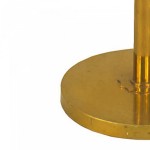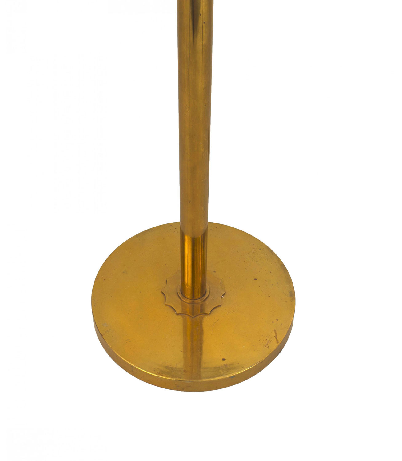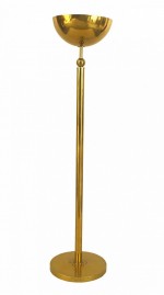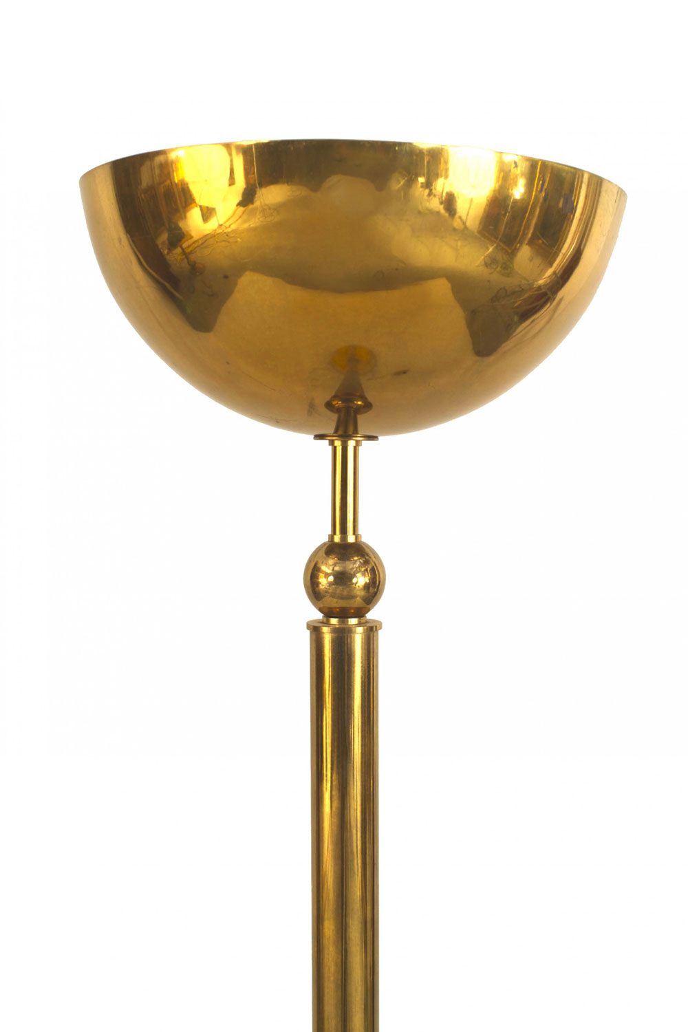 French 1940s brass floor lamp with a cylindrical shaft supporting a large dome and resting on a round base having a slighty raised centered scalloped design.