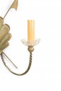 French Mid-Century (1940s) brass wall sconce with two arms with crystal bobeches, rope and trident design, and shell shaped medallion..