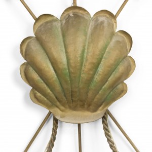 French Mid-Century (1940s) brass wall sconce with two arms with crystal bobeches, rope and trident design, and shell shaped medallion.