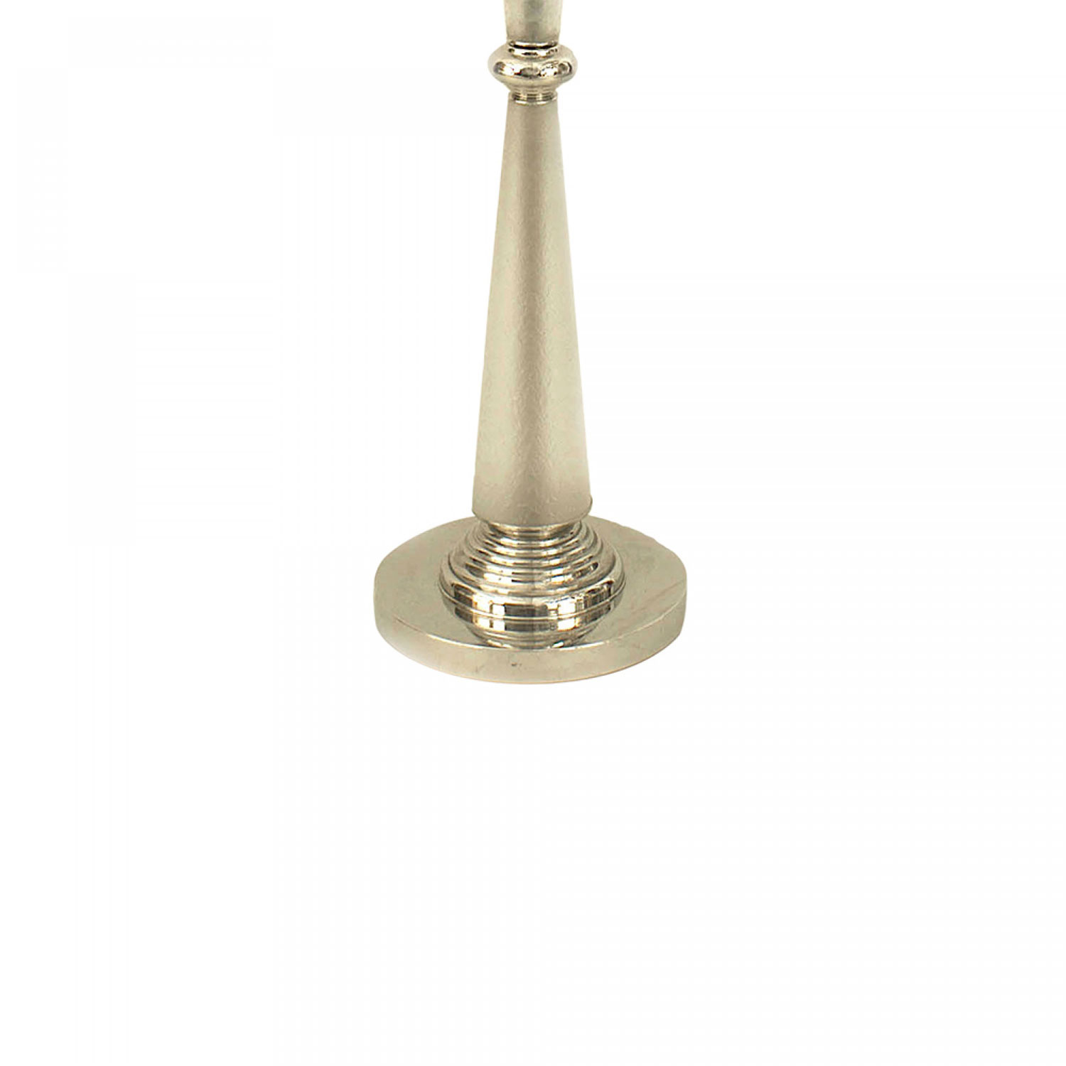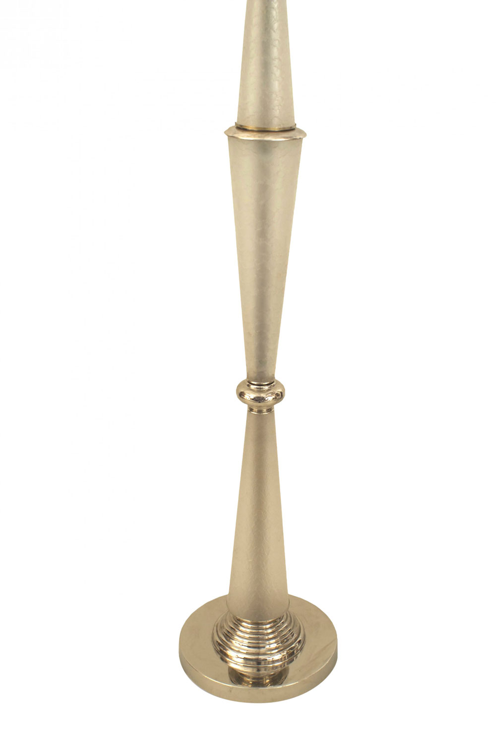 French 1940s frosted glass floor lamp with 3 shaped sections separated by chrome plated metal fittings and resting on a round tired base