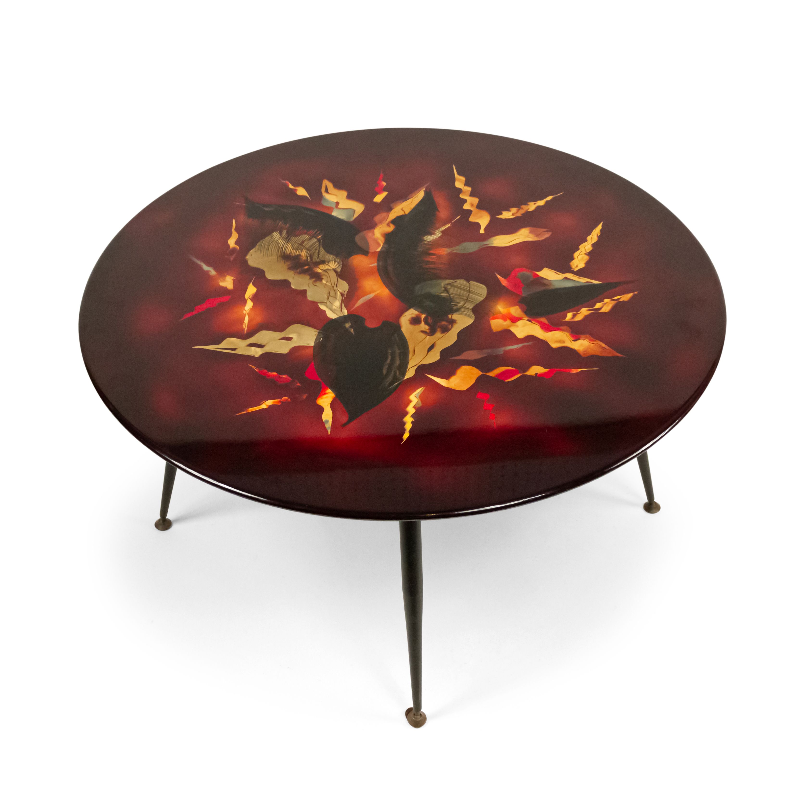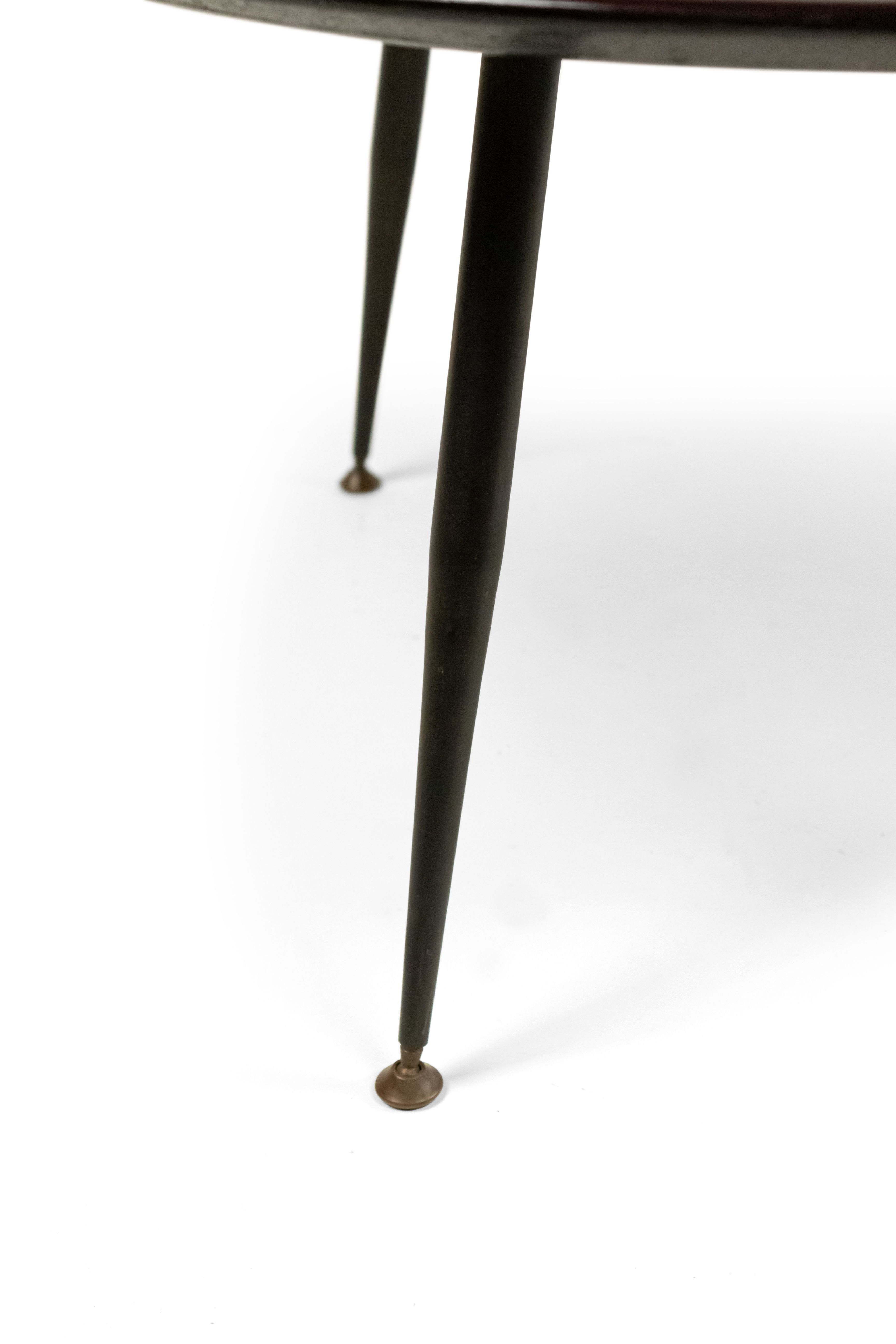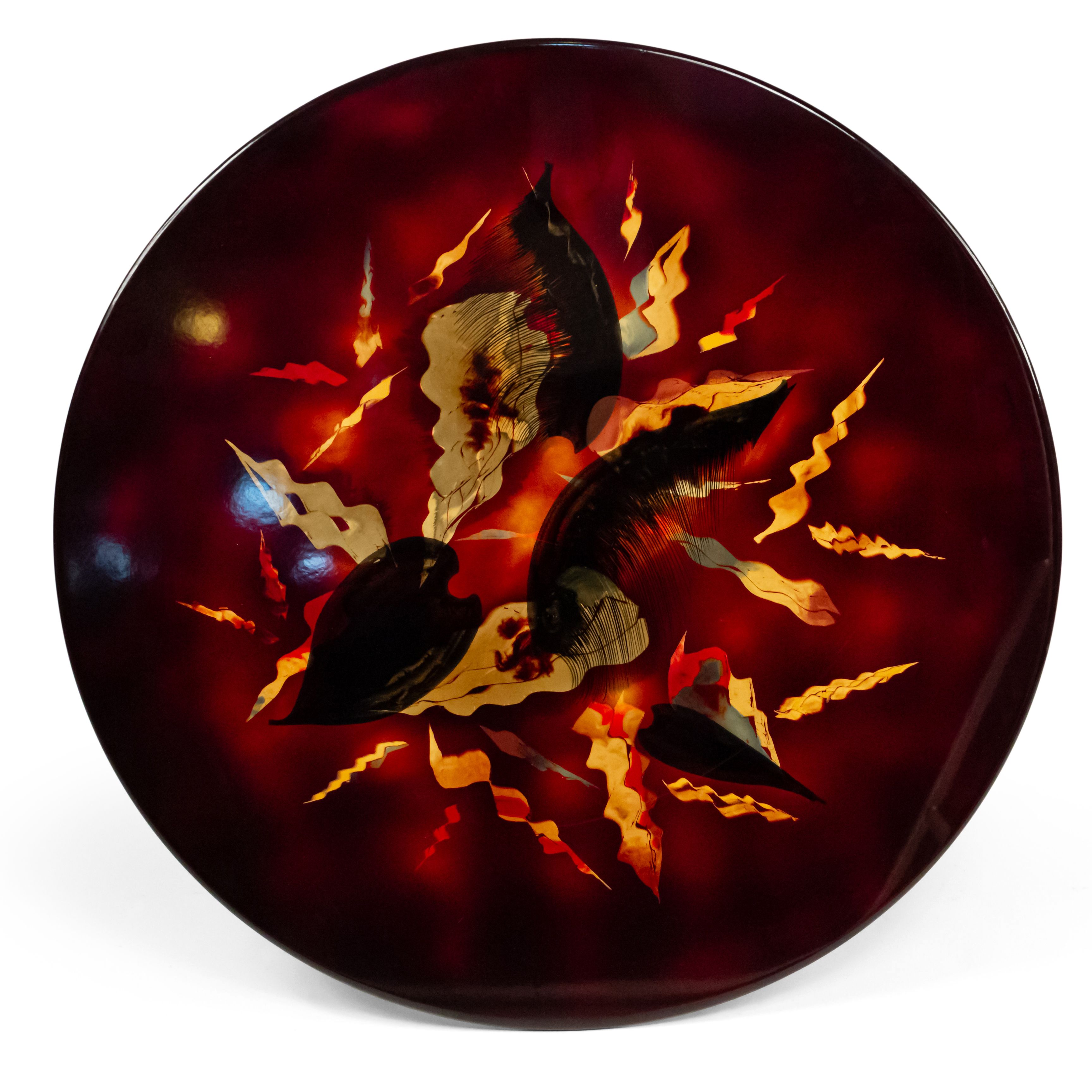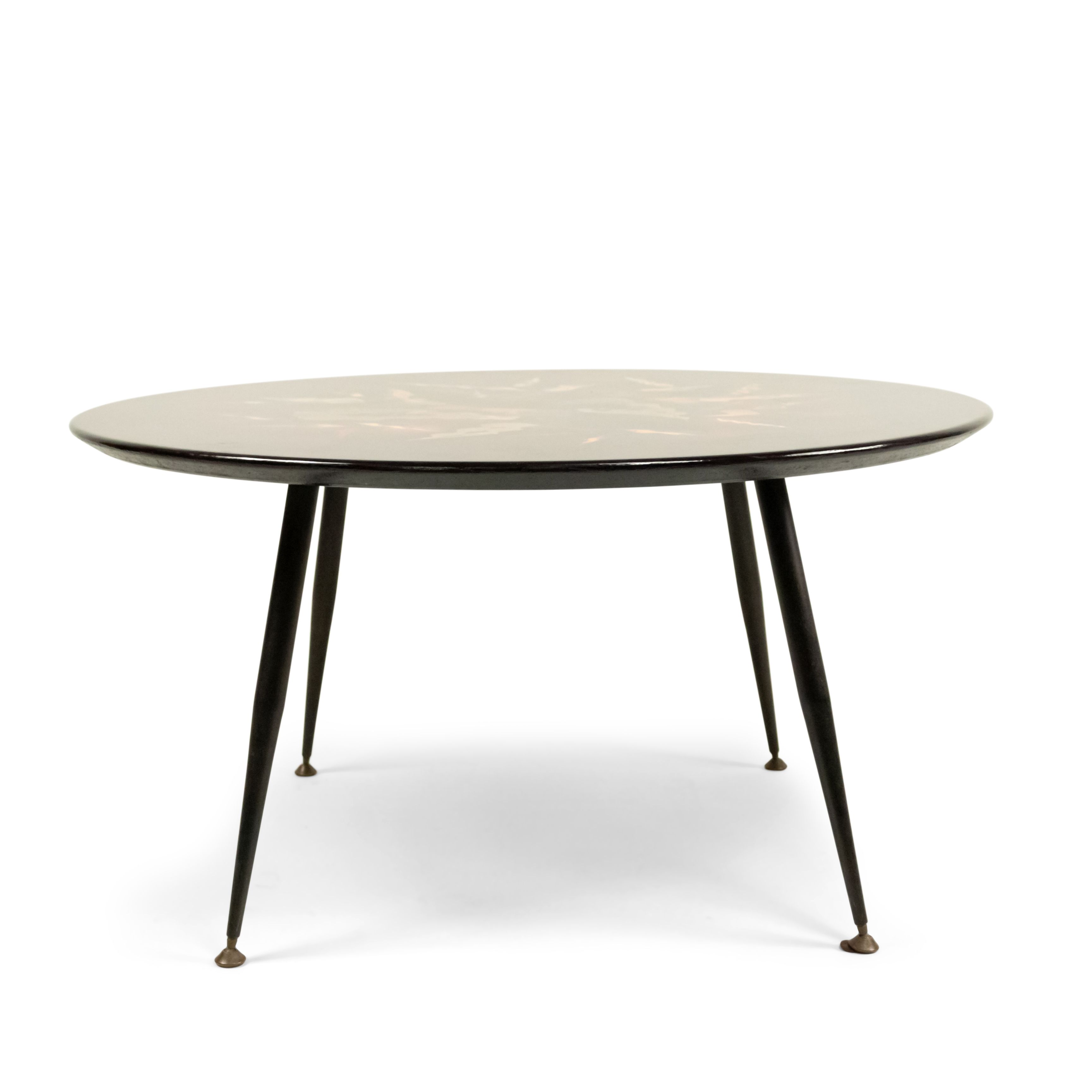 French Mid-Century low round top coffee table with a black and red geometric stylized leaf design top and four black metal legs with gilt bronze sabots (signed: BERNARD DUNAND)