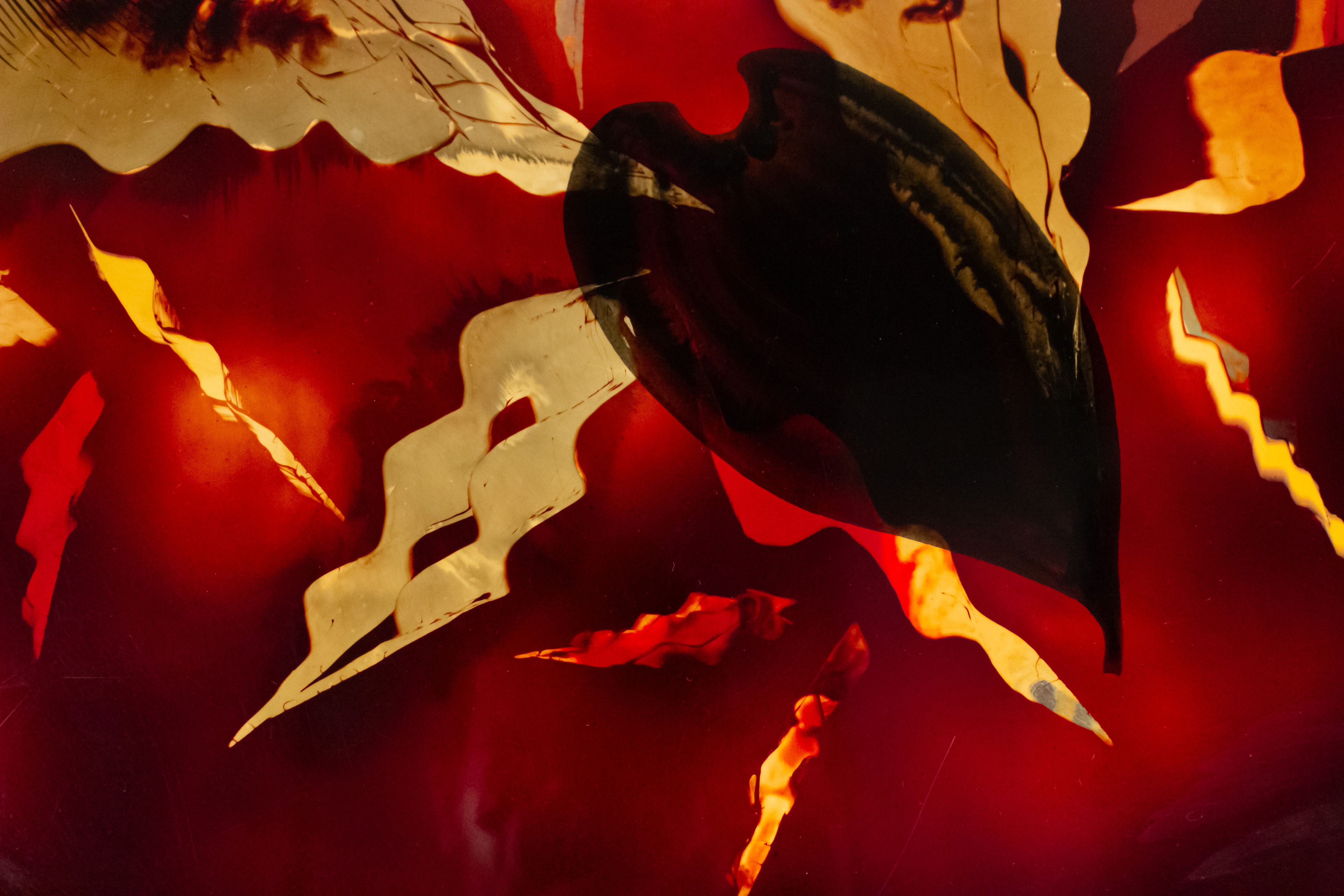 French Mid-Century low round top coffee table with a black and red geometric stylized leaf design top and four black metal legs with gilt bronze sabots (signed: BERNARD DUNAND).