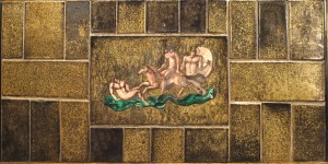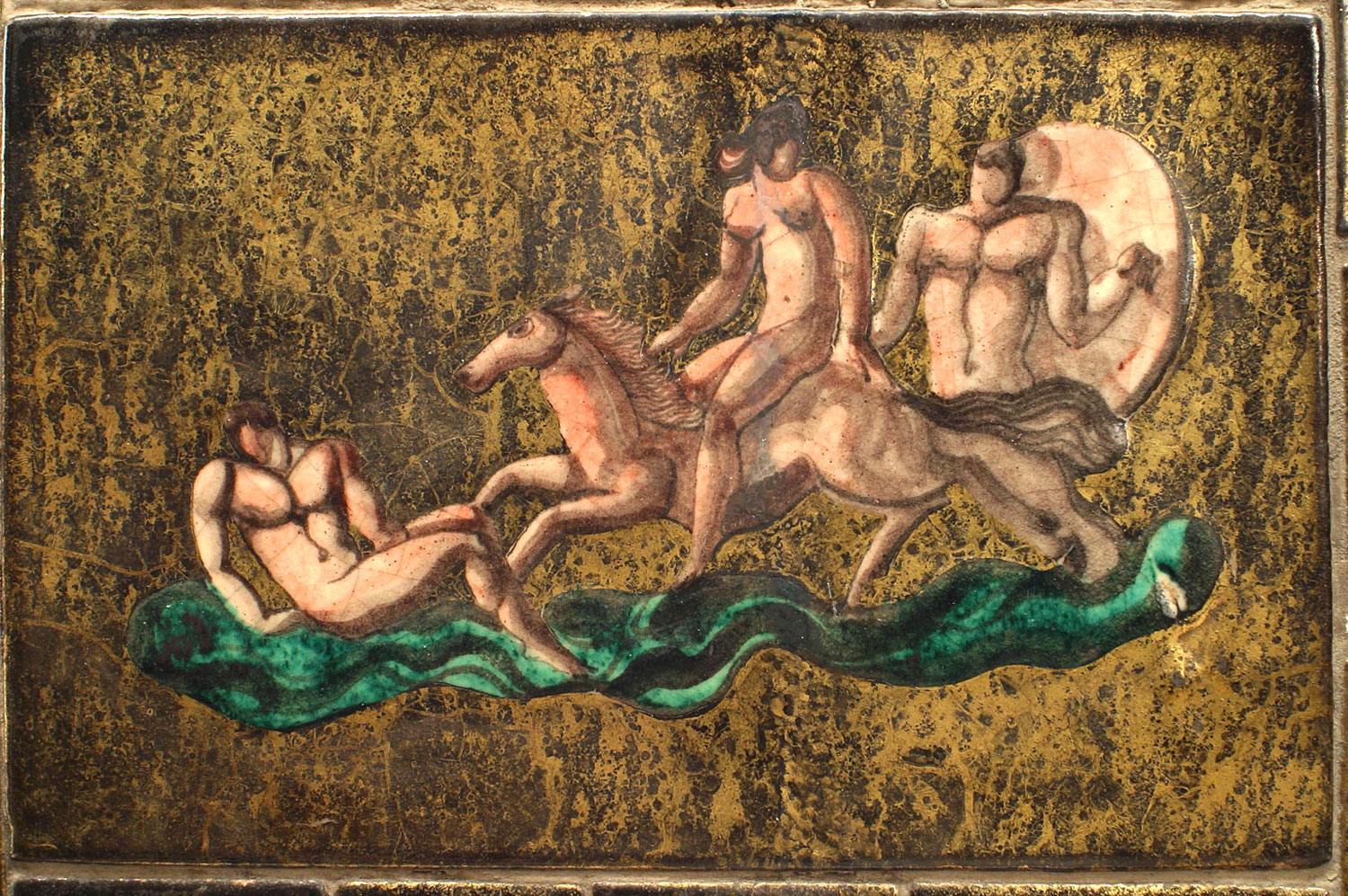French Mid-Century (1940s) ormolu mounted ebonized dining table with rectangular top inlaid with center glazed tiles depicting figures and horses. (Attributed to PIERRE LARDIN; tiles attributed to JEAN MAYODON).