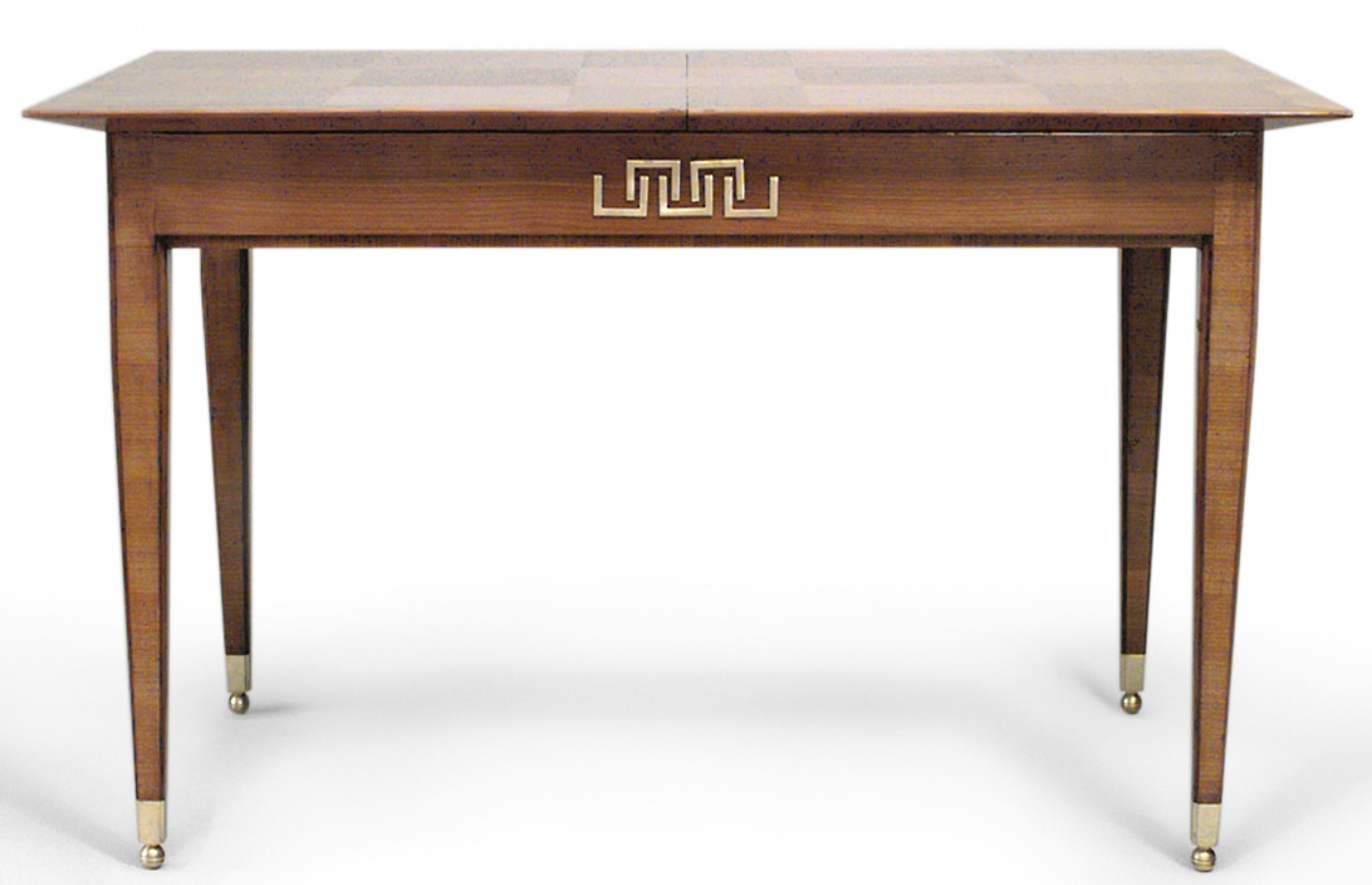 French Mid-Century (1940s) ormolu mounted, fruitwood, maple & parquetry extending dining table. (1 leaf - 17.5 inches) (By LUCIEN ROLLIN, branded "Lu Rollin/1946").