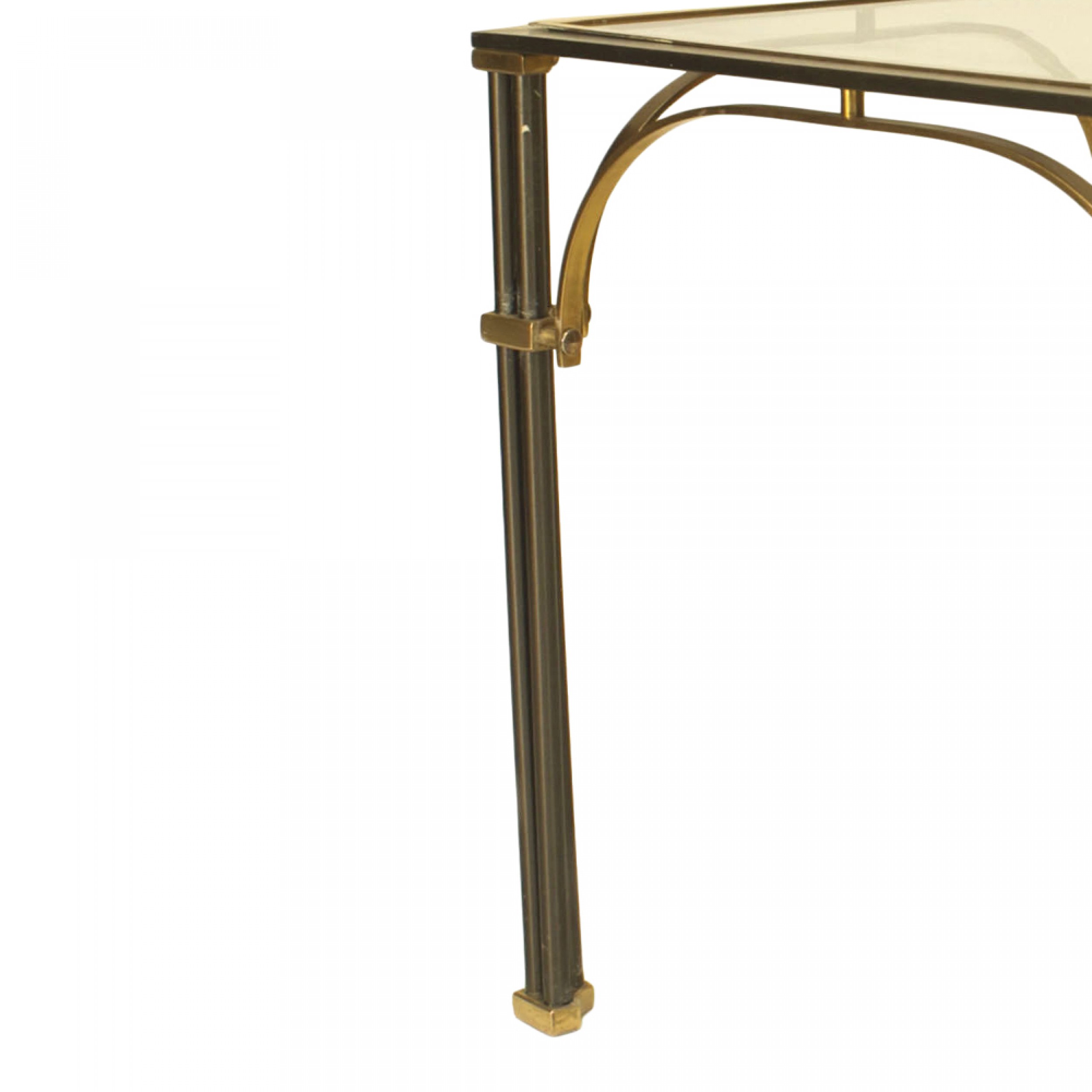 French Mid-Century (1950s) steel low square end table with a cluster leg design and brass trim supporting a glass top. (Attributed to MAISON JANSEN).
