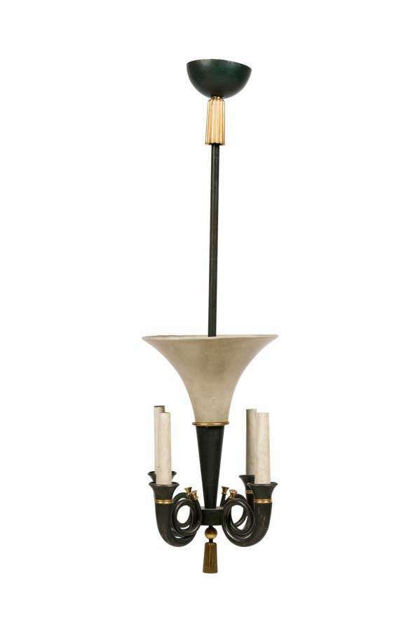 Style: Mid-Century Materials & Techniques: Brass, painted, scalloped Category: Lighting
