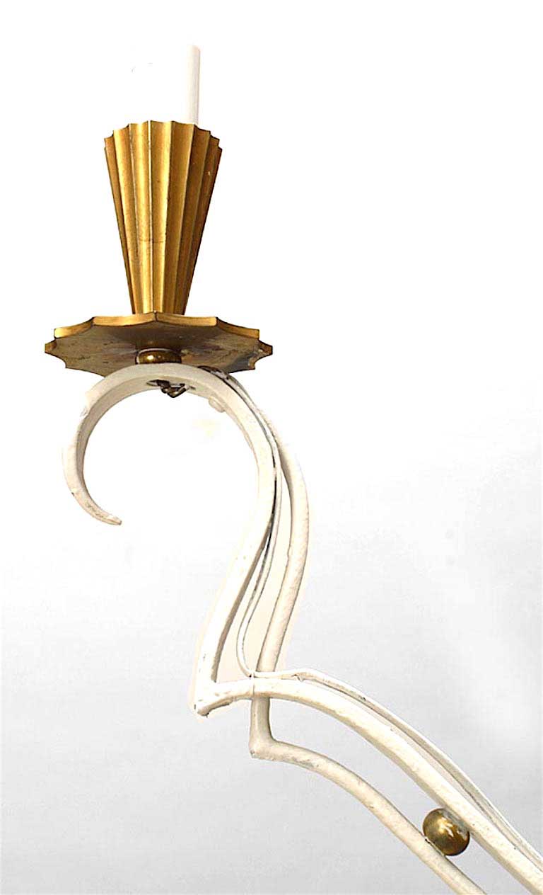 French Mid-Century (1940s) white painted and brass four light chandelier, the open lantern shaft issuing scrolling arms, scalloped drip pans & fluted tapering bobeches..