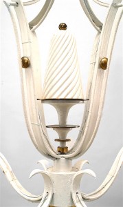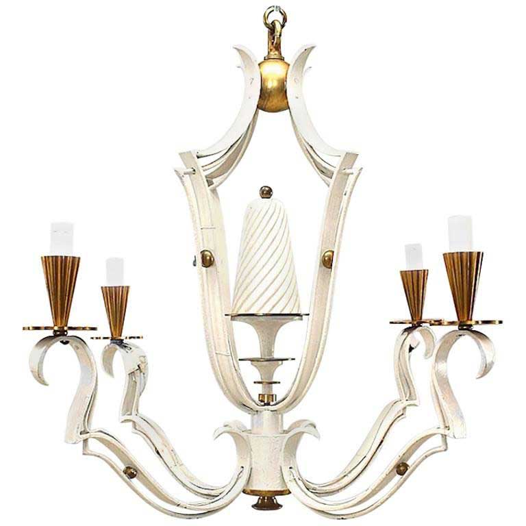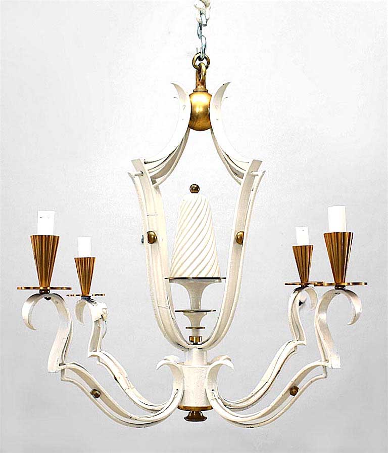 French Mid-Century (1940s) white painted and brass four light chandelier, the open lantern shaft issuing scrolling arms, scalloped drip pans & fluted tapering bobeches.